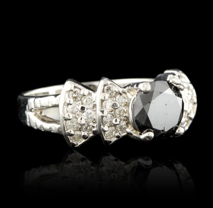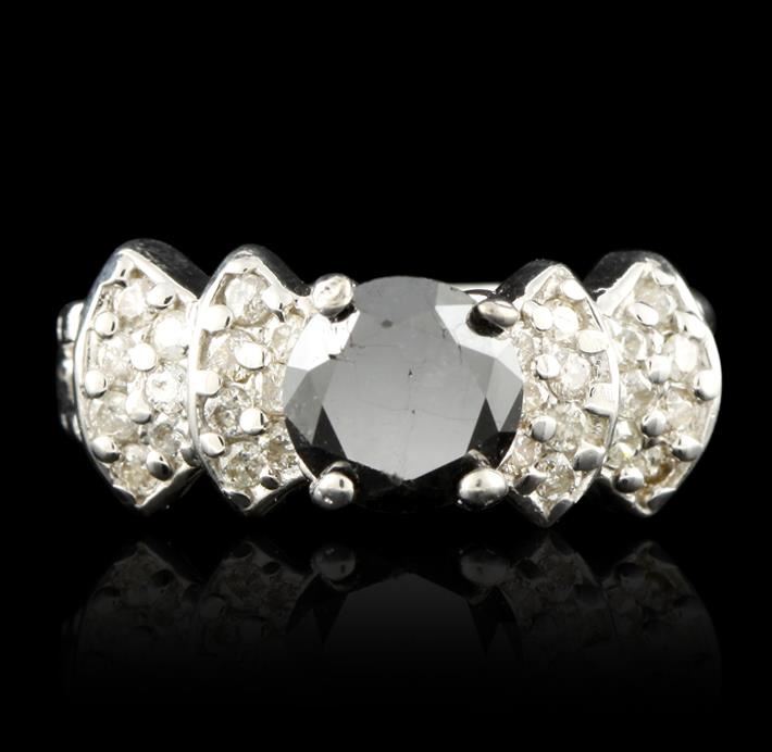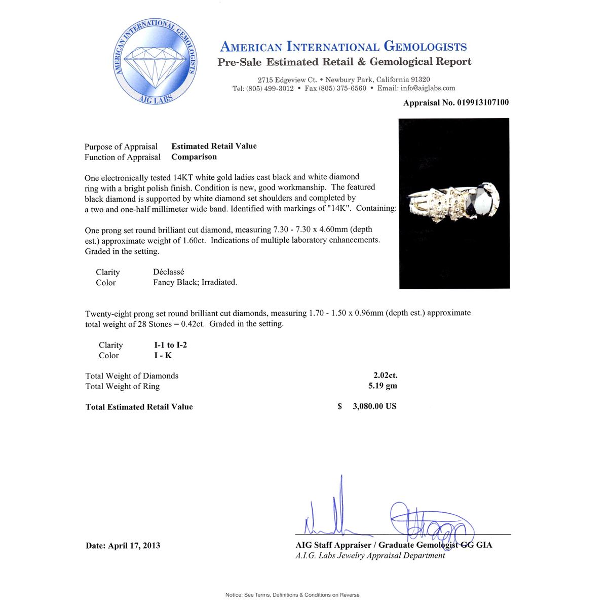 One electronically tested 14KT white gold ladies cast black and white diamond ring with a bright polish finish. Condition is new, good workmanship. The featured black diamond is supported by white diamond set shoulders and completed by a two and one-half millimeter wide band. Identified with markings of "14K". Containing: One prong set round brilliant cut diamond, measuring 7.30 - 7.30 x 4.60mm (depth est.) approximate weight of 1.60ct. Indications of multiple laboratory enhancements. Graded in the setting. Clarity Déclassé, Color Fancy Black; Irradiated. Twenty-eight prong set round brilliant cut diamonds, measuring 1.70 - 1.50 x 0.96mm (depth est.) approximate total weight of 28 stones = 0.42ct. Graded in the setting. Clarity I-1 to 1-2. Color I-K. Total weight of Diamonds 2.20ct. Total weight of ring 5.19gm. AIG Appraised at $3,080.00.
