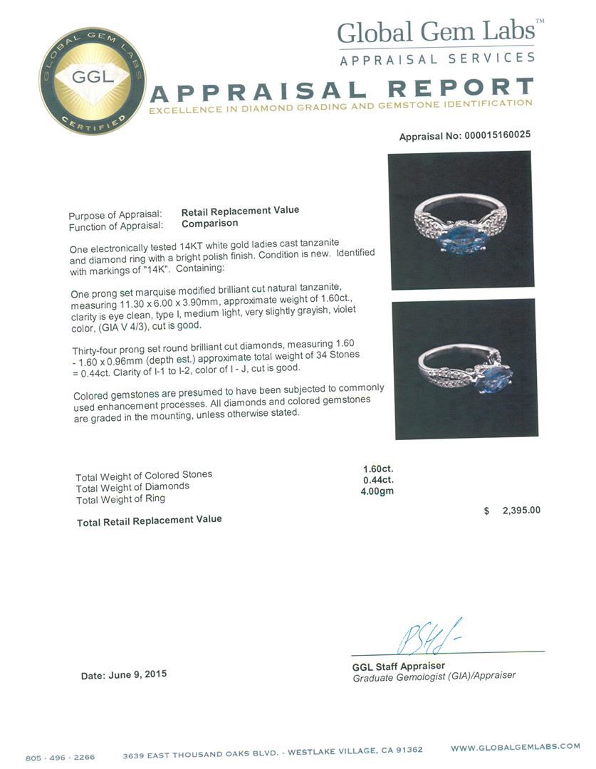 One electronically tested 14KT white gold ladies cast tanzanite and diamond ring with a bright polish finish. Identified with markings of "14K". Condition is new. Containing: One prong set marquise modified brilliant cut natural tanzanite, measuring 11.30 x 6.00 x 3.90mm, approximate weight of 1.60ct., clarity is eye clean, type I, medium light, very slightly grayish, violet color, (GIA V 4/3), cut is good. Thirty-Four prong set round brilliant cut diamonds, measuring 1.60 - 1.60 x 0.96mm (depth est.) approximate total weight of 34 Stones = 0.44ct. Clarity: I-1 to I-2. Color: I - J, Cut is Good. Colored gemstones are presumed to have been subjected to commonly used enhancement processes. All diamonds and colored gemstones are graded in the mounting, unless otherwise stated. Total Weight of Colored Stones 1.60ct. Total Weight of Diamonds 0.44ct. Total Weight of Ring 4.00 grams. GGL Appraised at $2,395.00.