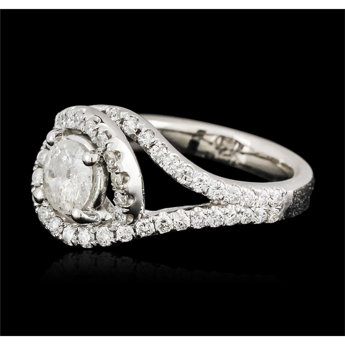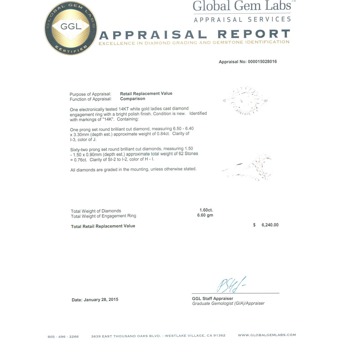 One electronically tested 14KT white gold ladies cast diamond engagement ring with a bright polish finish. Identified with markings of "14K". Condition is new. Containing: One prong set round brilliant cut diamond, measuring 6.50 - 6.40 x 3.30mm (depth est.) approximate weight of 0.84ct. Clarity: I-3. Color: J. Sixty-Two prong set round brilliant cut diamonds, measuring 1.50 - 1.50 x 0.90mm (depth est.) approximate total weight of 62 Stones = 0.76ct. Clarity: SI-2 to I-2. Color: H - I. All diamonds are graded in the mounting, unless otherwise stated. Total Weight of Diamonds 1.60ct. Total Weight of Engagement Ring 6.60 grams. GGL Appraised at $6,240.00.