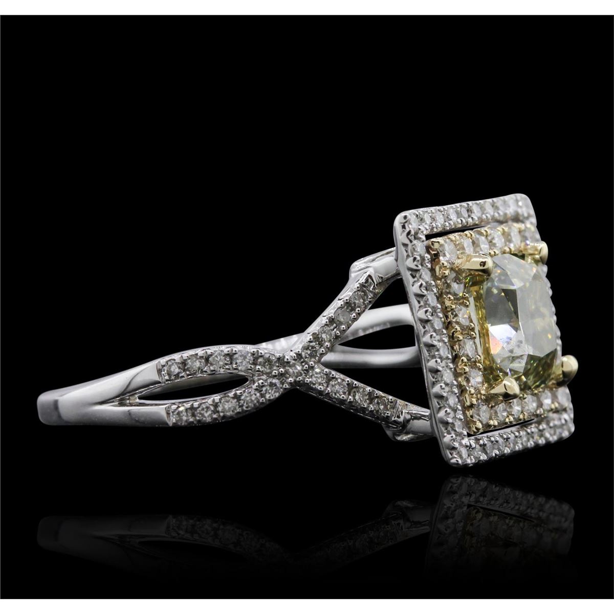 One electronically tested 14KT white gold ladies cast diamond unity ring. Condition is new, good workmanship. The featured diamond is set within two tiered diamond bezels supported by intertwining diamond set shoulders, completed by a one millimeter wide band. Bright polish finish with yellow gold accents. Identified with markings of "14K". Containing: One prong set cushion cut diamond, measuring 5.80 x 5.75 x 3.50mm (depth est.), 3.00% GTCF approximate weight of 1.20ct with a faint fluorescence. Graded in the setting. Clarity VS-1 Depth 60.9%Table 55.7% Ninety-Four prong set round brilliant cut diamonds, measuring 1.40 - 0.90 x 0.69mm (depth est.) approximate total weight of 94 Stones = 0.40ct. Graded in the setting. Clarity SI-1 to I-1 Color G - I Total Weight of Diamonds 1.60ct. Total Weight of Ring 3.33 grams. AIG Appraised at $12,360.00.