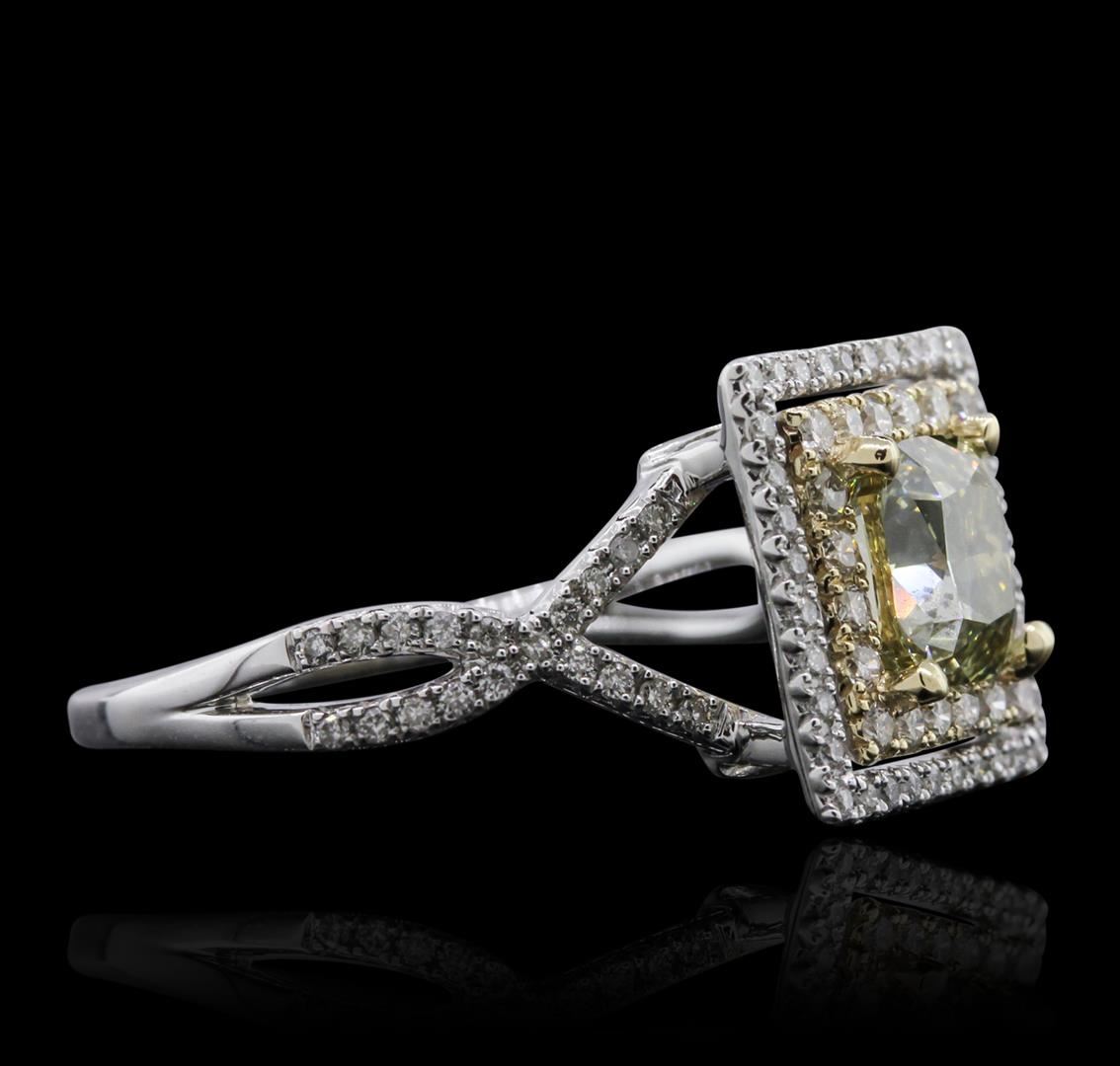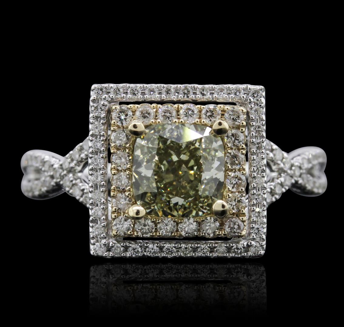 One electronically tested 14KT white gold ladies cast diamond unity ring. Condition is new, good workmanship. The featured diamond is set within two tiered diamond bezels supported by intertwining diamond set shoulders, completed by a one millimeter wide band. Bright polish finish with yellow gold accents. Identified with markings of "14K". Containing: One prong set cushion cut diamond, measuring 5.80 x 5.75 x 3.50mm (depth est.), 3.00% GTCF approximate weight of 1.20ct with a faint fluorescence. Graded in the setting. Clarity VS-1 Depth 60.9%Table 55.7% Ninety-Four prong set round brilliant cut diamonds, measuring 1.40 - 0.90 x 0.69mm (depth est.) approximate total weight of 94 Stones = 0.40ct. Graded in the setting. Clarity SI-1 to I-1 Color G - I Total Weight of Diamonds 1.60ct. Total Weight of Ring 3.33 grams. AIG Appraised at $12,360.00.