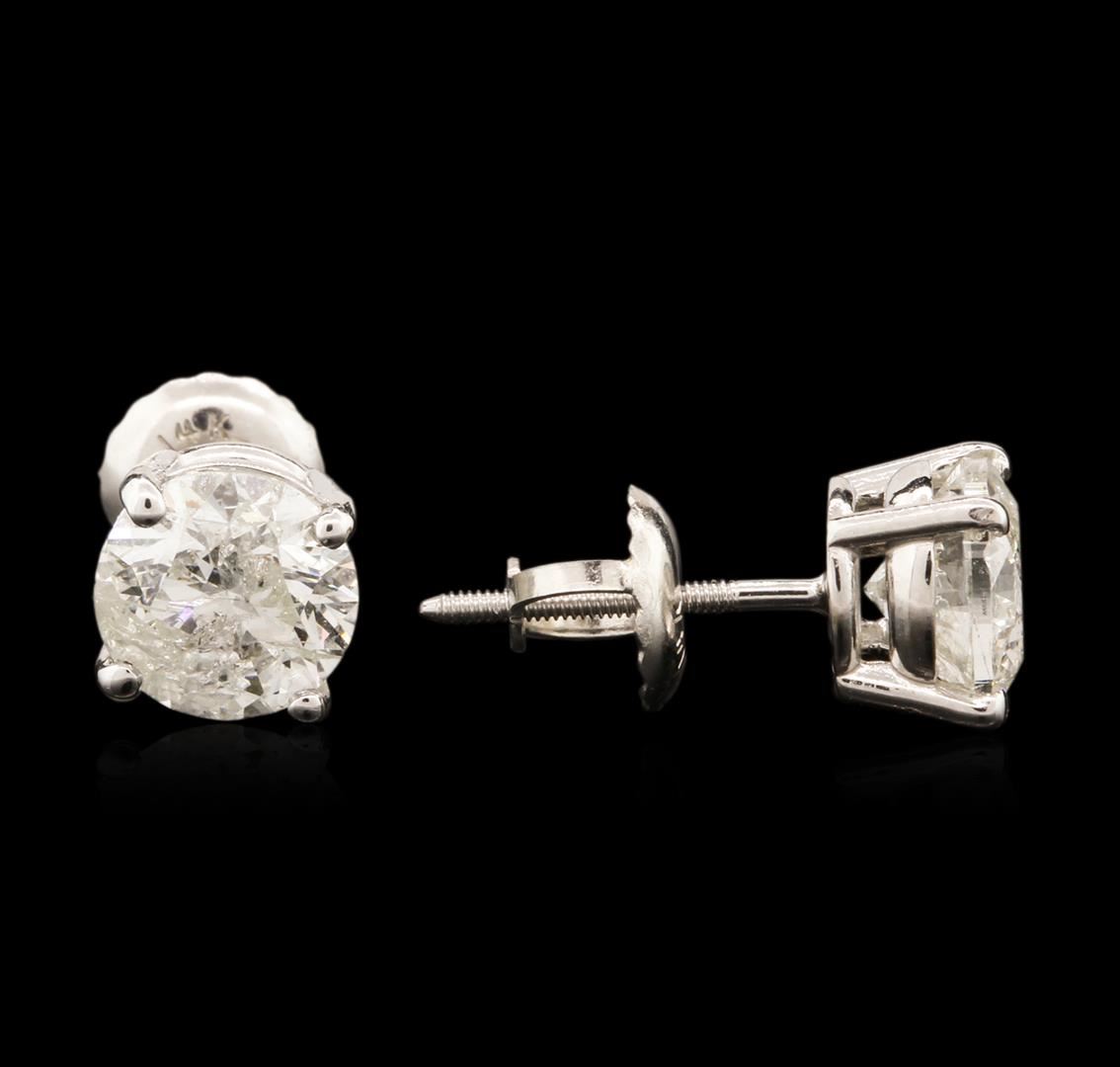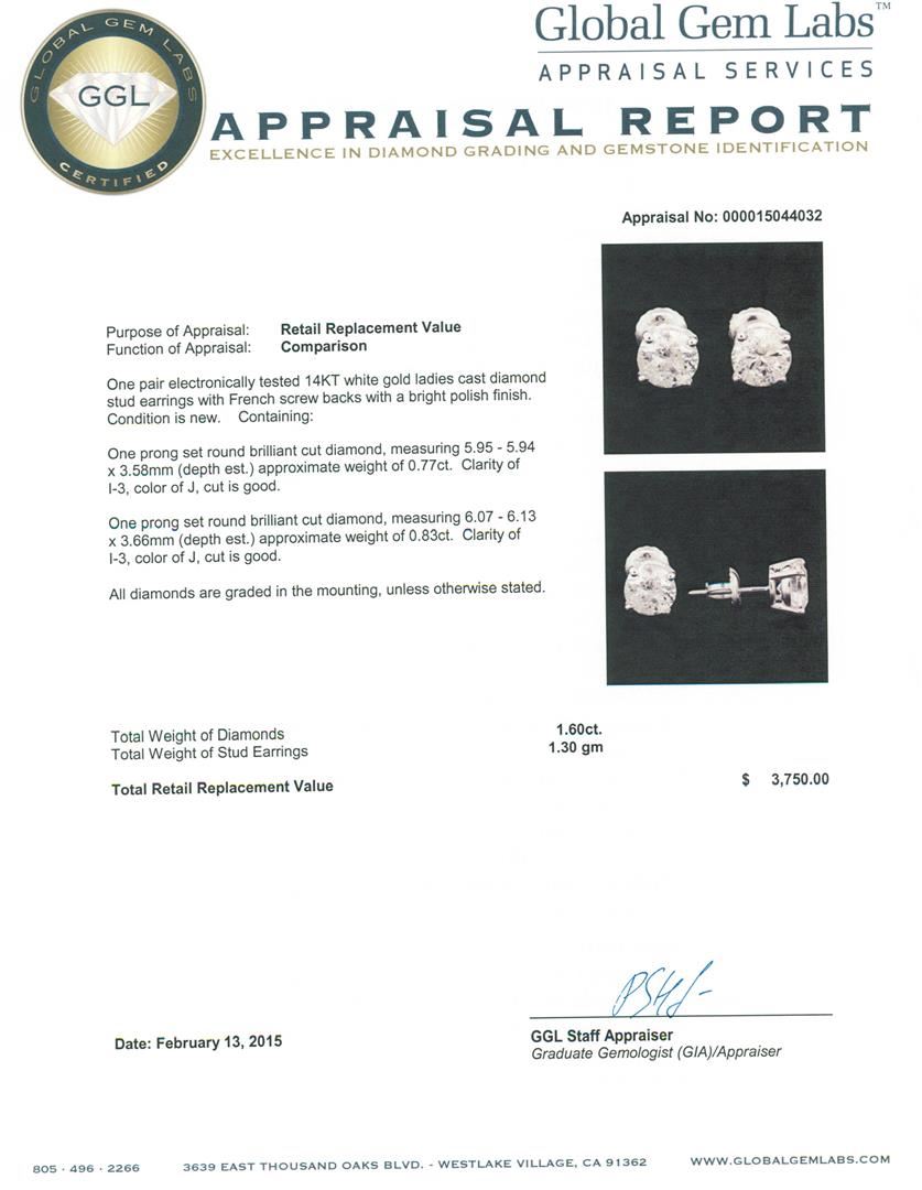 One pair electronically tested 14KT white gold ladies cast diamond stud earrings with French screw backs with a bright polish finish. Condition is new. Containing: One prong set round brilliant cut diamond, measuring 5.95 - 5.94 x 3.58mm (depth est.) approximate weight of 0.77ct. Clarity: I-3. Color: J, Cut is Good. One prong set round brilliant cut diamond, measuring 6.07 - 6.13 x 3.66mm (depth est.) approximate weight of 0.83ct. Clarity: I-3. Color: J, Cut is Good. All diamonds are graded in the mounting, unless otherwise stated. Total Weight of Diamonds 1.60ct. Total Weight of Stud Earrings 1.30 grams. GGL Appraised at $3,750.00.
