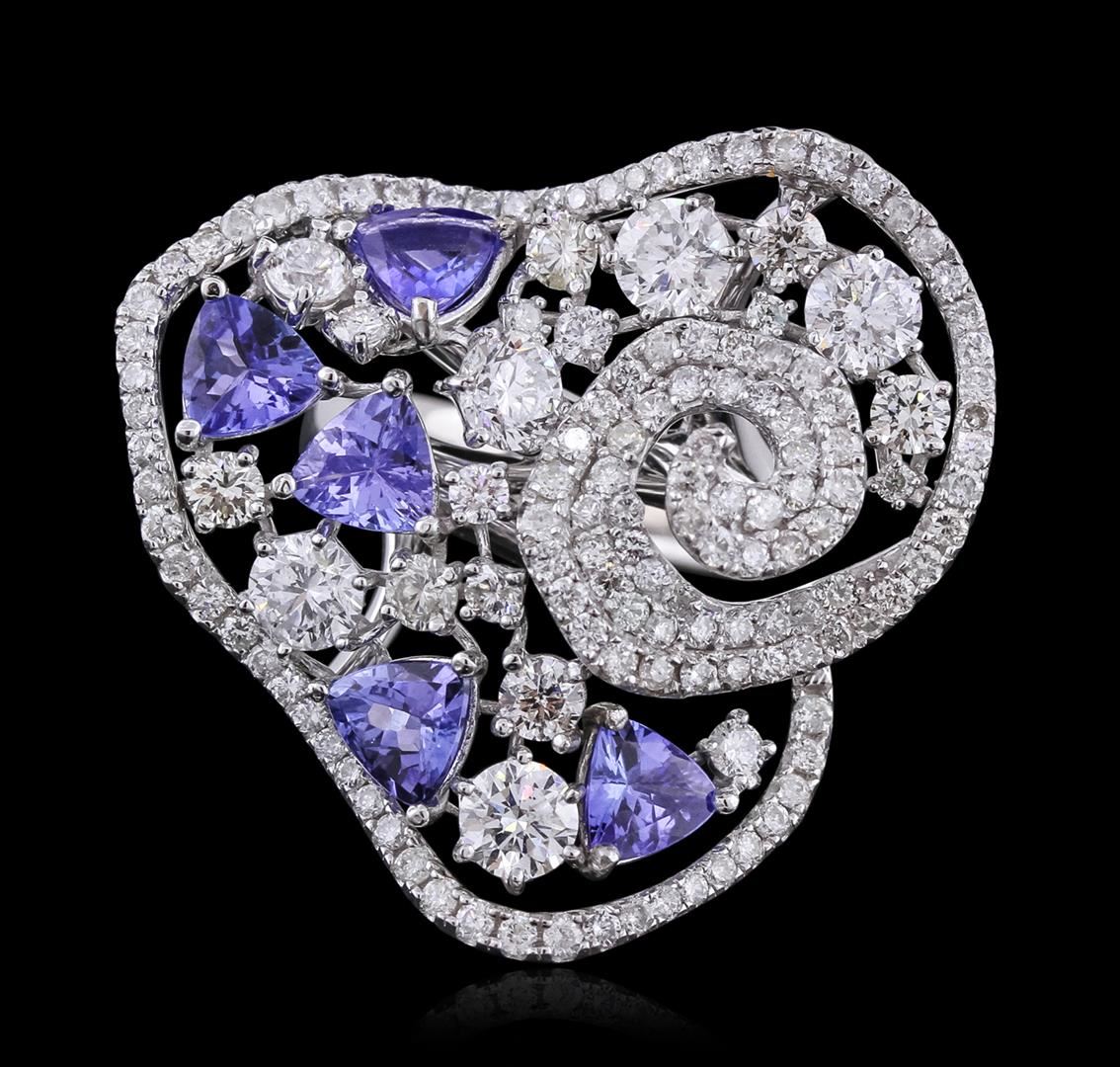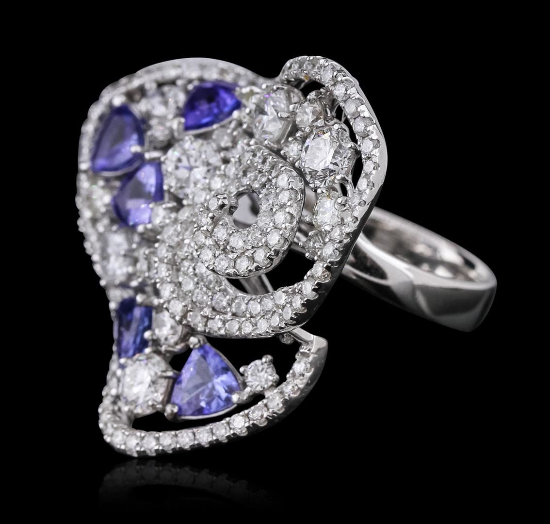 One electronically tested 14KT white gold ladies combination cast & assembled ring with a bright polish finish. Condition is new. Identified with markings of "585". Containing: Five prong set triangle modified brilliant cut natural tanzanites, measuring 4.50 x 4.50 x 2.61mm, approximate. Total Weight of 1.60ct., clarity is eye clean, type I, medium light, very slightly grayish, violet color, (GIA V 4/3), cut is good. One Hundred Thirty-One prong set round brilliant cut diamonds, measuring 1.30 - 1.30 x 0.78mm (depth est.) approximate. Total Weight of 131 Stones = 1.05ct. Clarity: I-1 to I-2. Color: I - J, Cut is Good. Eight prong set round brilliant cut diamonds, measuring 3.00 - 2.00 x 1.50mm (depth est.) approximate. Total Weight of 8 Stones = 0.46ct. Clarity: SI-1 to SI-2. Color: I - J, Cut is Good. Six prong set round brilliant cut diamonds, measuring 4.40 - 4.40 x 2.64mm (depth est.) approximate. Total Weight of 6 Stones = 1.87ct. Clarity: SI-1 to SI-2. Color: J, Cut is Good. Colored gemstones are presumed to have been subjected to commonly used enhancement processes. All diamonds and colored gemstones are graded in the mounting, unless otherwise stated. Total Weight of Colored Stones 1.60ct. Total Weight of Diamonds 3.38ct. Total Weight of Ring 12.70 grams. GGL Appraised at $19,490.00.