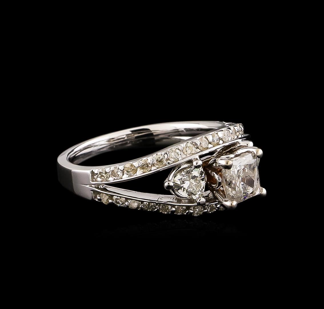 One electronically tested 14KT white gold ladies cast & assembled diamond unity ring with a bright polish finish. Condition is new, good workmanship. The featured diamond is set within a rose gold basket accented by a single diamond on either side and supported by mirroring diamond ribbons. The ring is completed by a two millimeter wide band. Identified with markings of "K14". Containing: One prong set princess cut diamond, measuring 4.70 x 4.65 x 3.50mm (depth est.) approximate weight of 0.72ct. Naturally occurring internal & external characteristics are present, including natural iridescence. Graded in the setting. Clarity: I-2. Color: 75.3%. Table 76.3%. Two prong set triangle brilliant cut diamonds, measuring 3.80 x 3.70 x 2.30mm (depth est.) approximate. Total Weight of 2 Stones = 0.40ct. Graded in the setting. Clarity: VS-1 to VS-2. Color: H - I Thirty-Four prong set round brilliant cut diamonds, measuring 1.50 - 1.40 x 0.87mm (depth est.) approximate. Total Weight of 34 Stones = 0.49ct. Graded in the setting. Clarity: I-1 to I-2. Color: H - J. Total Weight of Diamonds 1.61ct. Total Weight of Ring 5.05 grams. AIG Appraised at $7,955.00.