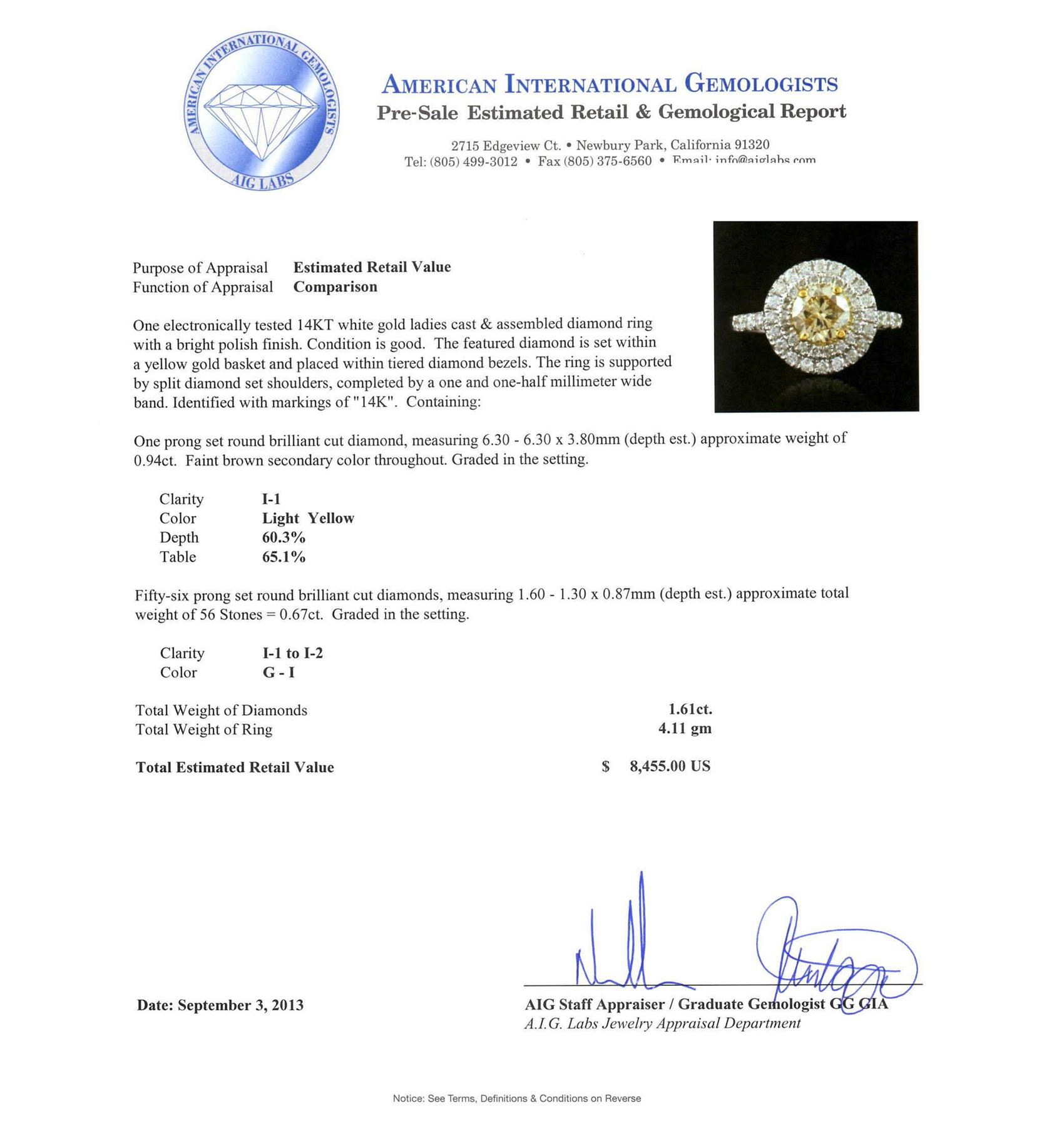 One electronically tested 14KT white gold ladies cast & assembled diamond ring with a bright polish finish. Condition is good. The featured diamond is set within a yellow gold basket and placed within tiered diamond bezels. The ring is supported by split diamond set shoulders, completed by a one and one-half millimeter wide band. Identified with markings of "14K". Containing: One prong set round brilliant cut diamond, measuring 6.30 - 6.30 x 3.80mm (depth est.) approximate weight of 0.94ct. Faint brown secondary color throughout. Graded in the setting. Clarity I-1. Color Light Yellow. Depth 60.3%. Table 65.1%. Fifty-six prong set round brilliant cut diamonds, measuring 1.60 - 1.30 x 0.87mm (depth est.) approximate total weight of 56 Stones = 0.67ct. Graded in the setting. Clarity I-1 to 1-2. Color G -- I. Total Weight of Diamonds 1.61ct. Total Weight of Ring 4.11gm. AIG Appraised at $8,455.00.