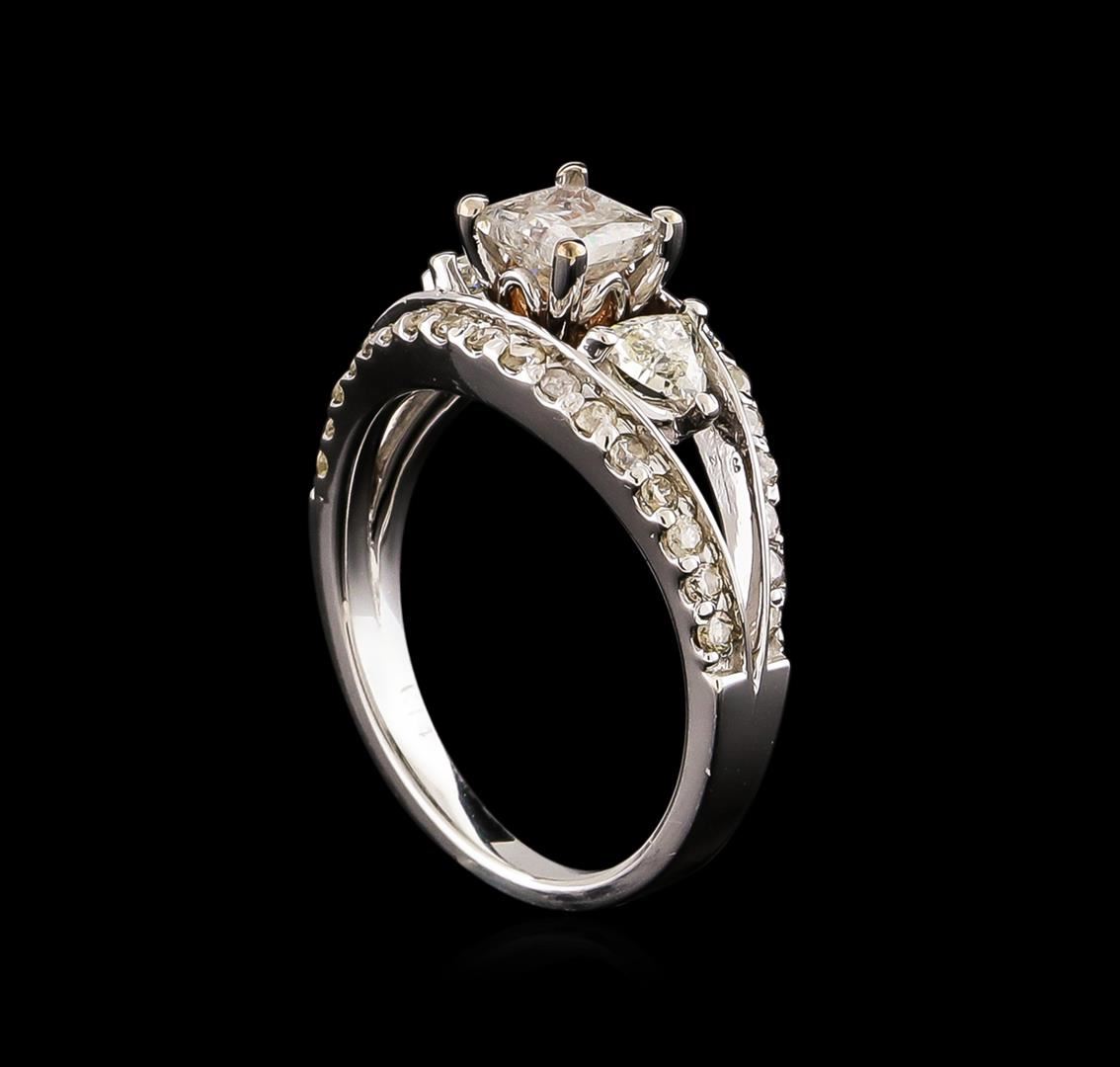 One electronically tested 14KT white gold ladies cast & assembled diamond unity ring with a bright polish finish. Condition is new, good workmanship. The featured diamond is set within a rose gold basket accented by a single diamond on either side and supported by mirroring diamond ribbons. The ring is completed by a two millimeter wide band. Identified with markings of "K14". Containing: One prong set princess cut diamond, measuring 4.70 x 4.65 x 3.50mm (depth est.) approximate weight of 0.72ct. Naturally occurring internal & external characteristics are present, including natural iridescence. Graded in the setting. Clarity: I-2. Color: 75.3%. Table 76.3%. Two prong set triangle brilliant cut diamonds, measuring 3.80 x 3.70 x 2.30mm (depth est.) approximate. Total Weight of 2 Stones = 0.40ct. Graded in the setting. Clarity: VS-1 to VS-2. Color: H - I Thirty-Four prong set round brilliant cut diamonds, measuring 1.50 - 1.40 x 0.87mm (depth est.) approximate. Total Weight of 34 Stones = 0.49ct. Graded in the setting. Clarity: I-1 to I-2. Color: H - J. Total Weight of Diamonds 1.61ct. Total Weight of Ring 5.05 grams. AIG Appraised at $7,955.00.