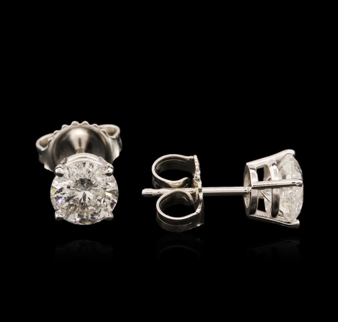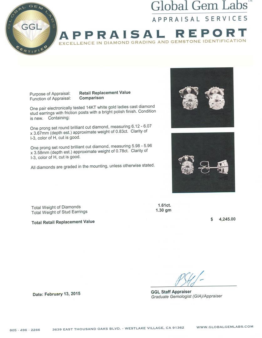 One pair electronically tested 14KT white gold ladies cast diamond stud earrings with friction posts with a bright polish finish. Condition is new. Containing: One prong set round brilliant cut diamond, measuring 6.12 - 6.07 x 3.67mm (depth est.) approximate weight of 0.83ct. Clarity: I-3. Color: H, Cut is Good. One prong set round brilliant cut diamond, measuring 5.98 - 5.96 x 3.58mm (depth est.) approximate weight of 0.78ct. Clarity: I-3. Color: H, Cut is Good. All diamonds are graded in the mounting, unless otherwise stated. Total Weight of Diamonds 1.61ct. Total Weight of Stud Earrings 1.30 grams. GGL Appraised at $4,245.00.