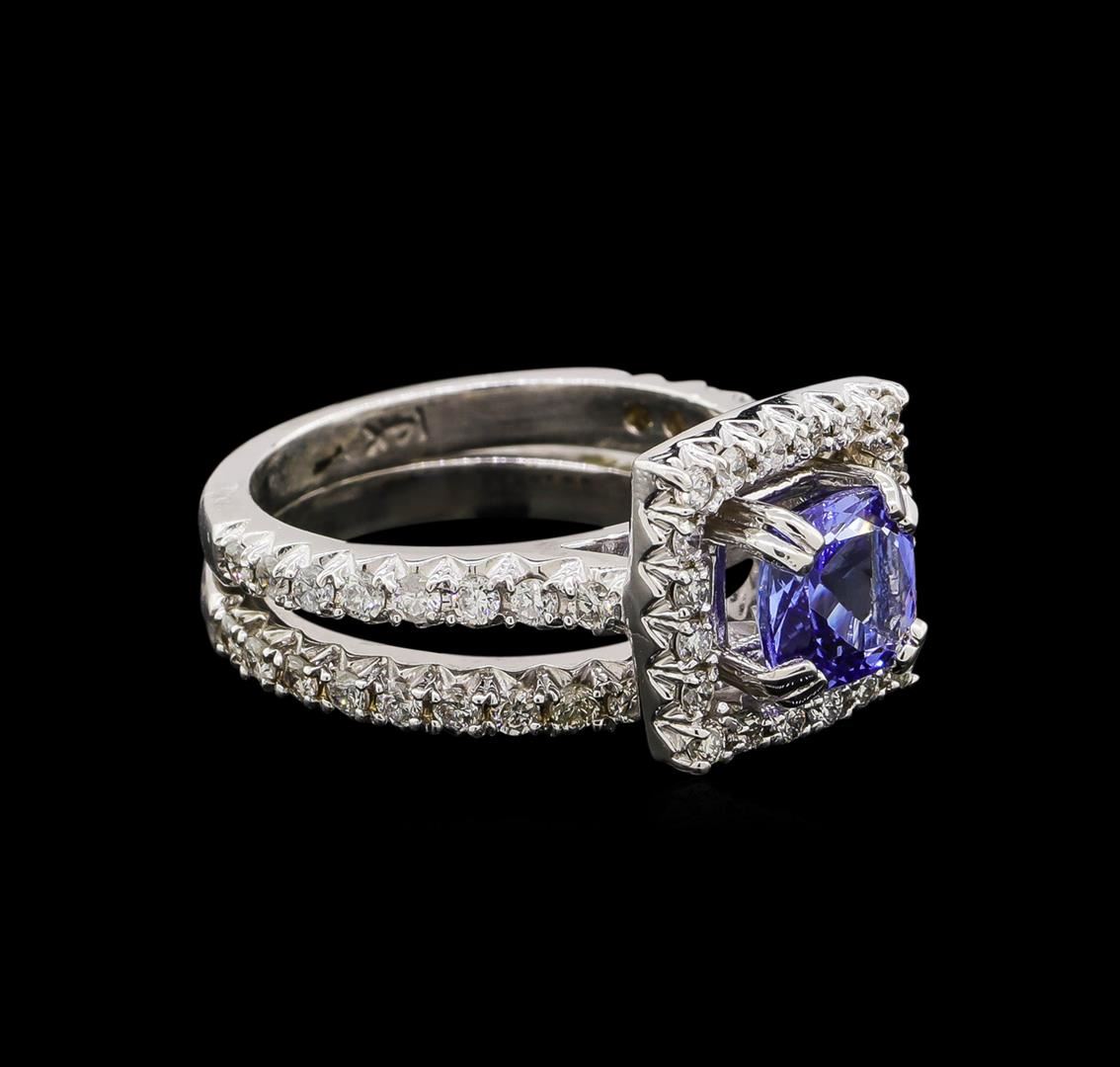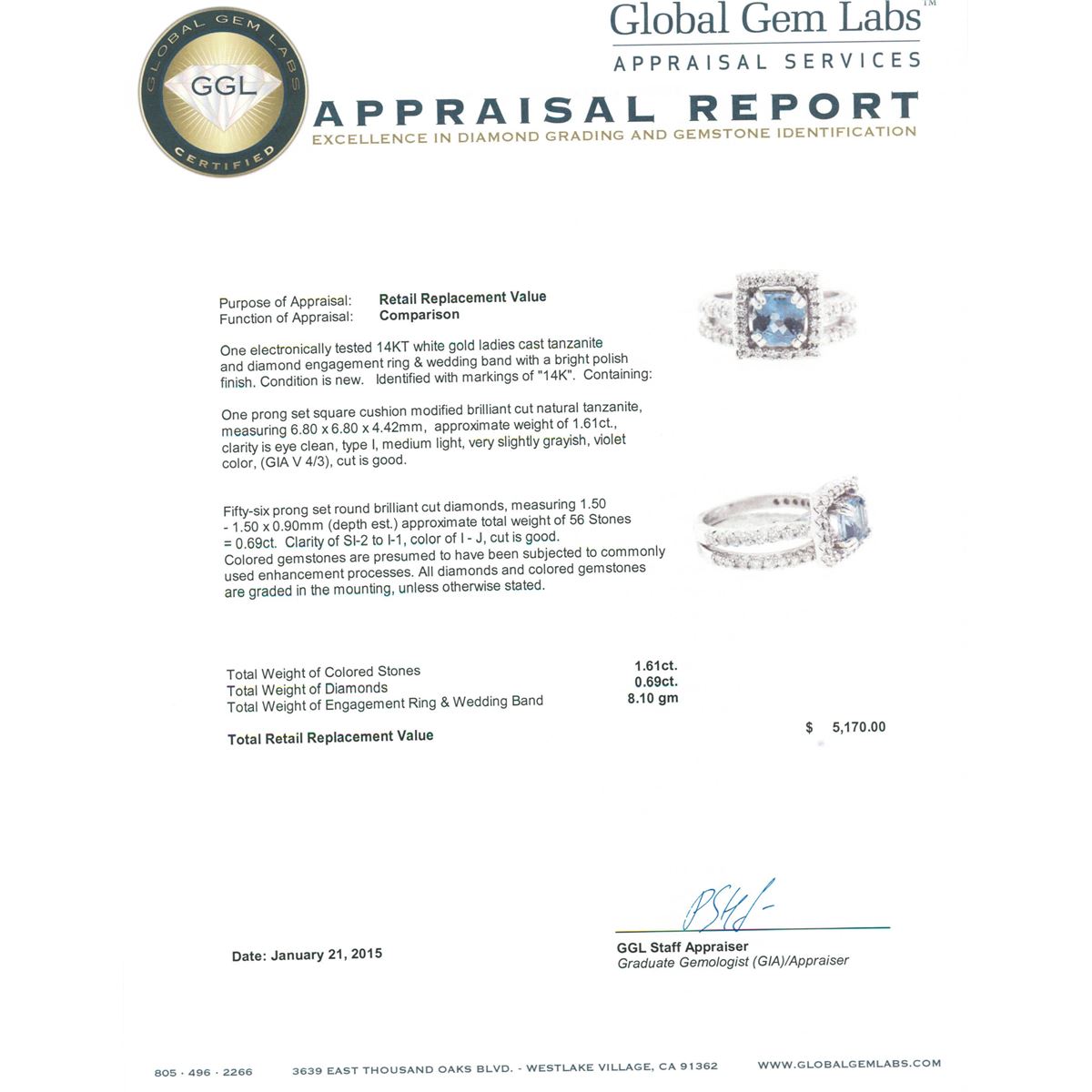 One electronically tested 14KT white gold ladies cast tanzanite and diamond engagement ring & wedding band with a bright polish finish. Identified with markings of "14K". Condition is new. Containing: One prong set square cushion modified brilliant cut natural tanzanite, measuring 6.80 x 6.80 x 4.42mm, approximate weight of 1.61ct., clarity is eye clean, type I, medium light, very slightly grayish, violet color, (GIA V 4/3), cut is good. Fifty-Six prong set round brilliant cut diamonds, measuring 1.50 - 1.50 x 0.90mm (depth est.) approximate total weight of 56 Stones = 0.69ct. Clarity: SI-2 to I-1. Color: I - J, Cut is Good. Colored gemstones are presumed to have been subjected to commonly used enhancement processes. All diamonds and colored gemstones are graded in the mounting, unless otherwise stated. Total Weight of Colored Stones 1.61ct. Total Weight of Diamonds 0.69ct. Total Weight of Engagement Ring & Wedding Band 8.10 grams. GGL Appraised at $5,170.00.