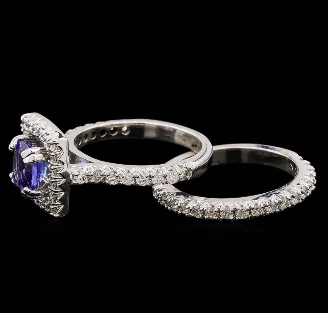 One electronically tested 14KT white gold ladies cast tanzanite and diamond engagement ring & wedding band with a bright polish finish. Identified with markings of "14K". Condition is new. Containing: One prong set square cushion modified brilliant cut natural tanzanite, measuring 6.80 x 6.80 x 4.42mm, approximate weight of 1.61ct., clarity is eye clean, type I, medium light, very slightly grayish, violet color, (GIA V 4/3), cut is good. Fifty-Six prong set round brilliant cut diamonds, measuring 1.50 - 1.50 x 0.90mm (depth est.) approximate total weight of 56 Stones = 0.69ct. Clarity: SI-2 to I-1. Color: I - J, Cut is Good. Colored gemstones are presumed to have been subjected to commonly used enhancement processes. All diamonds and colored gemstones are graded in the mounting, unless otherwise stated. Total Weight of Colored Stones 1.61ct. Total Weight of Diamonds 0.69ct. Total Weight of Engagement Ring & Wedding Band 8.10 grams. GGL Appraised at $5,170.00.