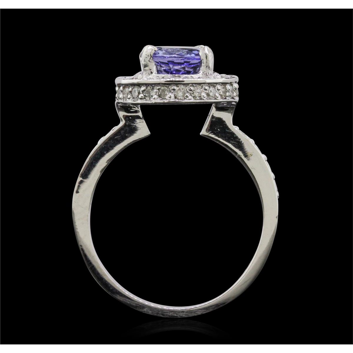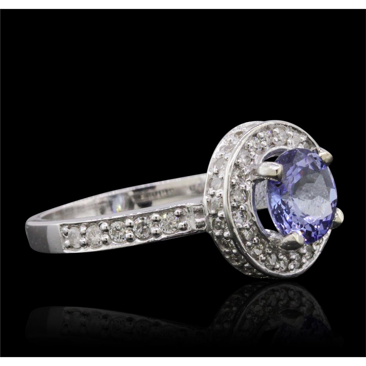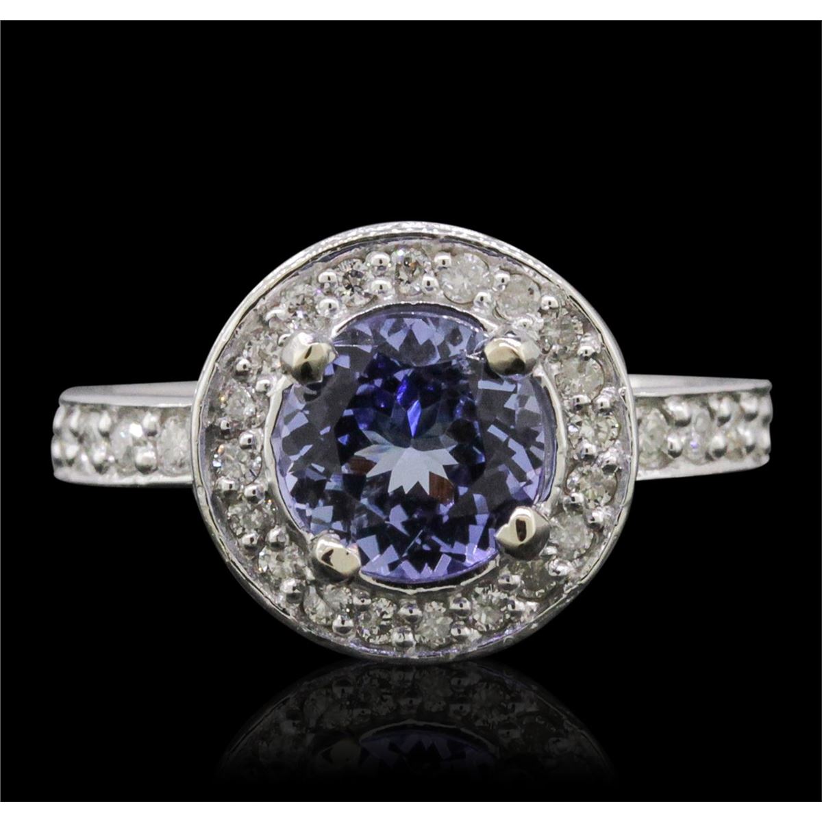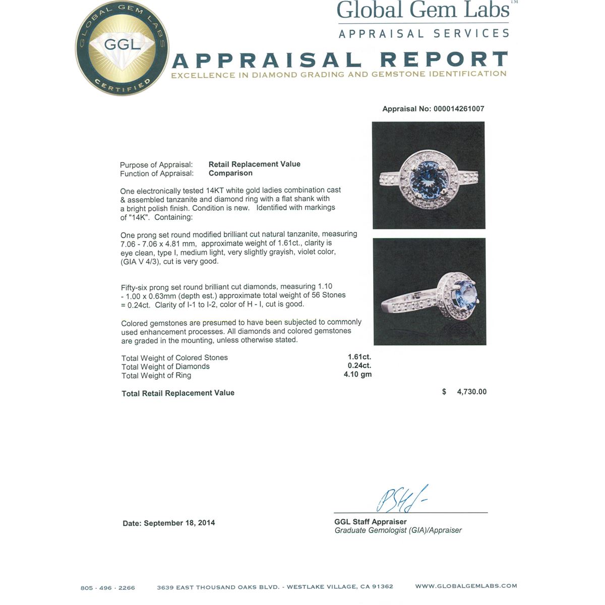 One electronically tested 14KT white gold ladies combination cast & assembled tanzanite and diamond ring with a flat shank with a bright polish finish. Identified with markings of "14K". Condition is new. Containing: One prong set round modified brilliant cut natural tanzanite, measuring 7.06 - 7.06 x 4.81 mm, approximate weight of 1.61ct., clarity is eye clean, type I, medium light, very slightly grayish, violet color, (GIA V 4/3), cut is very good. Fifty-Six prong set round brilliant cut diamonds, measuring 1.10 - 1.00 x 0.63mm (depth est.) approximate total weight of 56 Stones = 0.24ct. Clarity: I-1 to I-2. Color: H - I, Cut is Good. Colored gemstones are presumed to have been subjected to commonly used enhancement processes. All diamonds and colored gemstones are graded in the mounting, unless otherwise stated. Total Weight of Colored Stones 1.61ct. Total Weight of Diamonds 0.24ct. Total Weight of Ring 4.10 grams. GGL Appraised at $4,730.00.