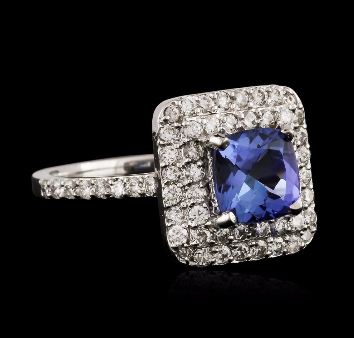 One electronically tested 14KT white gold ladies cast tanzanite and diamond ring with a bright polish finish. Identified with markings of "K14". Condition is new. Containing: One prong set square cushion modified brilliant cut natural tanzanite, measuring 6.80 x 6.80 x 4.42mm, approximate weight of 1.61ct., clarity is eye clean, type I, medium light, very slightly grayish, violet color, (GIA V 4/3), cut is good. Fifty prong set round brilliant cut diamonds, measuring 1.30 - 1.30 x 0.78mm (depth est.) approximate total weight of 50 Stones = 0.40ct. Clarity: SI-1 to I-1. Color: H - I, Cut is Good. Colored gemstones are presumed to have been subjected to commonly used enhancement processes. All diamonds and colored gemstones are graded in the mounting, unless otherwise stated. Total Weight of Colored Stones 1.61ct. Total Weight of Diamonds 0.40ct. Total Weight of Ring 3.60 grams. GGL Appraised at $3,270.00.