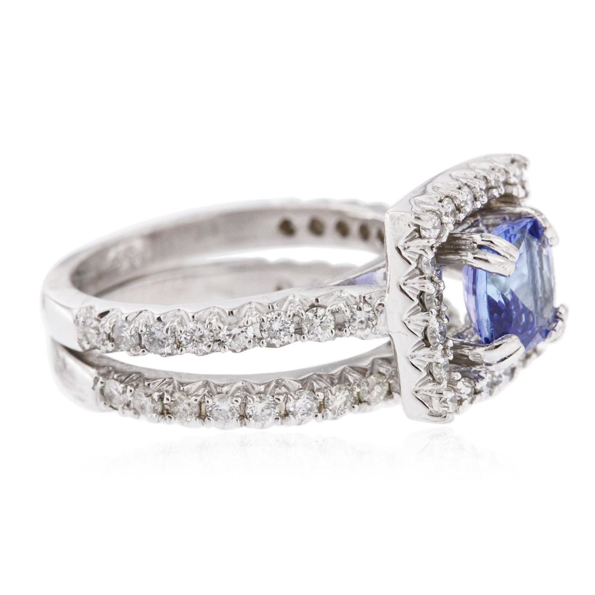 One electronically tested 14KT white gold ladies cast tanzanite and diamond engagement ring & wedding band with a bright polish finish. Identified with markings of "14K". Condition is new. Containing: One prong set square cushion modified brilliant cut natural tanzanite, measuring 6.80 x 6.80 x 4.42mm, approximate weight of 1.61ct., clarity is eye clean, type I, medium light, very slightly grayish, violet color, (GIA V 4/3), cut is good. Fifty-Six prong set round brilliant cut diamonds, measuring 1.50 - 1.50 x 0.90mm (depth est.) approximate total weight of 56 Stones = 0.69ct. Clarity: SI-2 to I-1. Color: I - J, Cut is Good. Colored gemstones are presumed to have been subjected to commonly used enhancement processes. All diamonds and colored gemstones are graded in the mounting, unless otherwise stated. Total Weight of Colored Stones 1.61ct. Total Weight of Diamonds 0.69ct. Total Weight of Engagement Ring & Wedding Band 8.10 grams. GGL Appraised at $5,170.00.