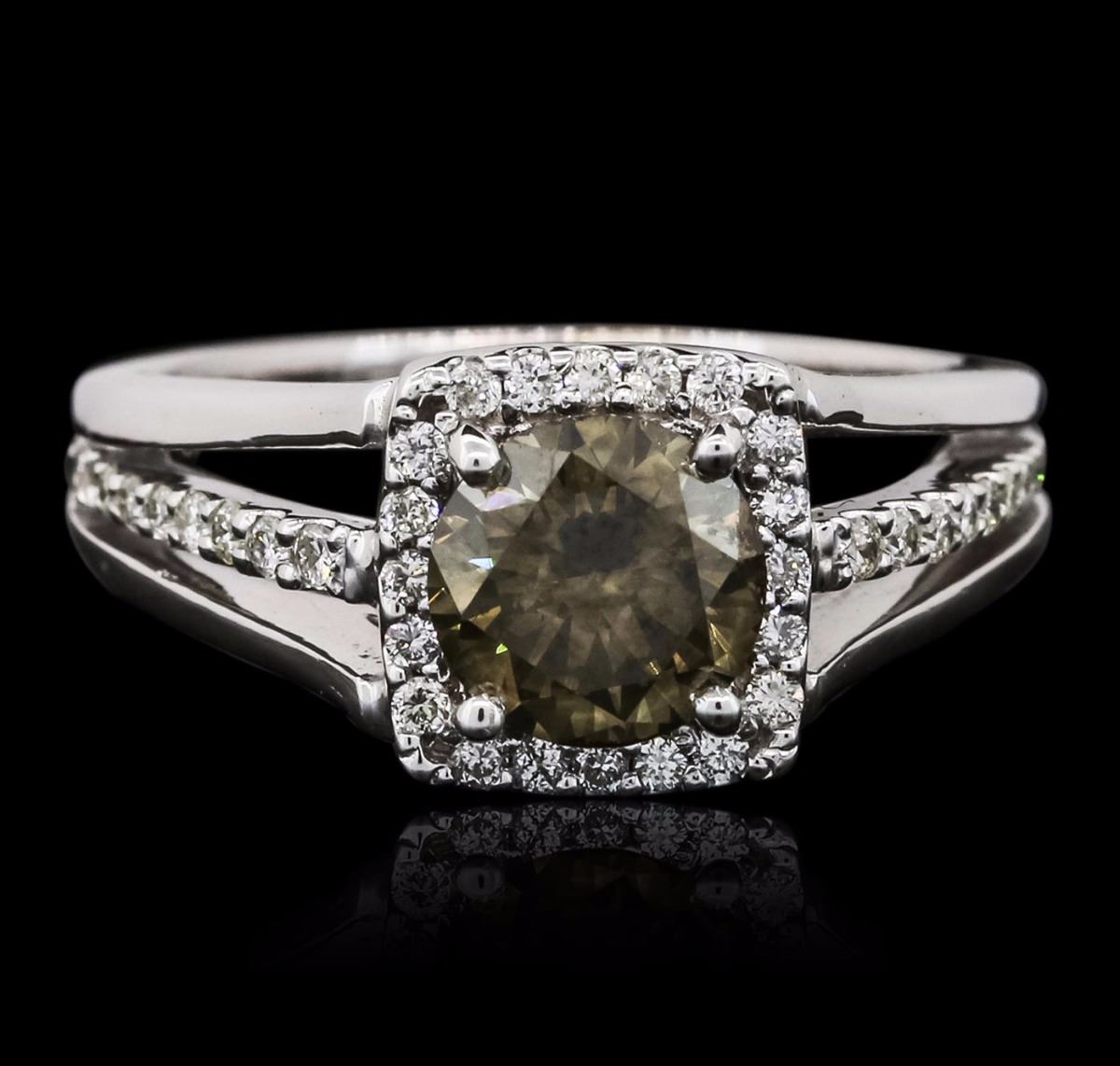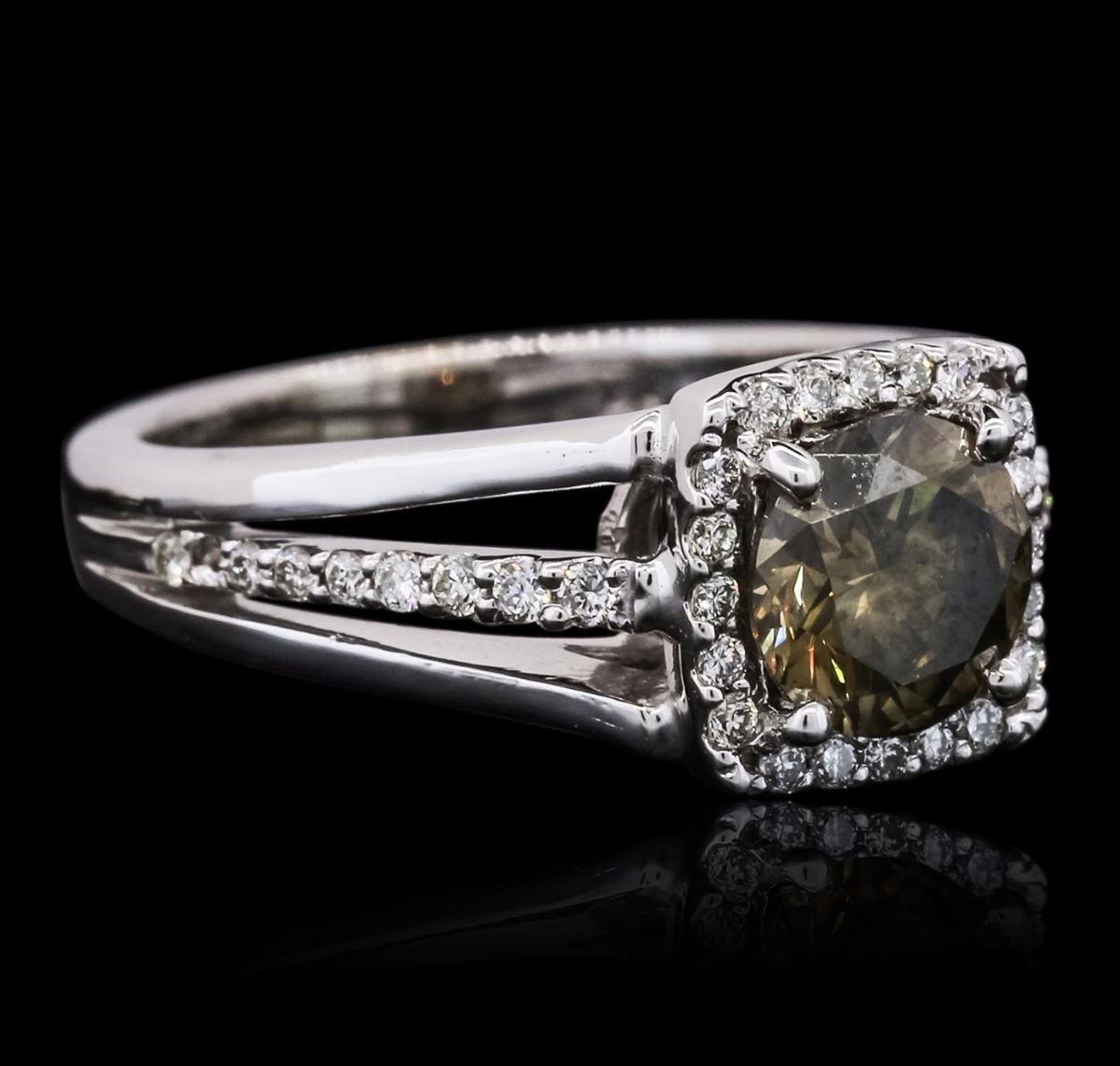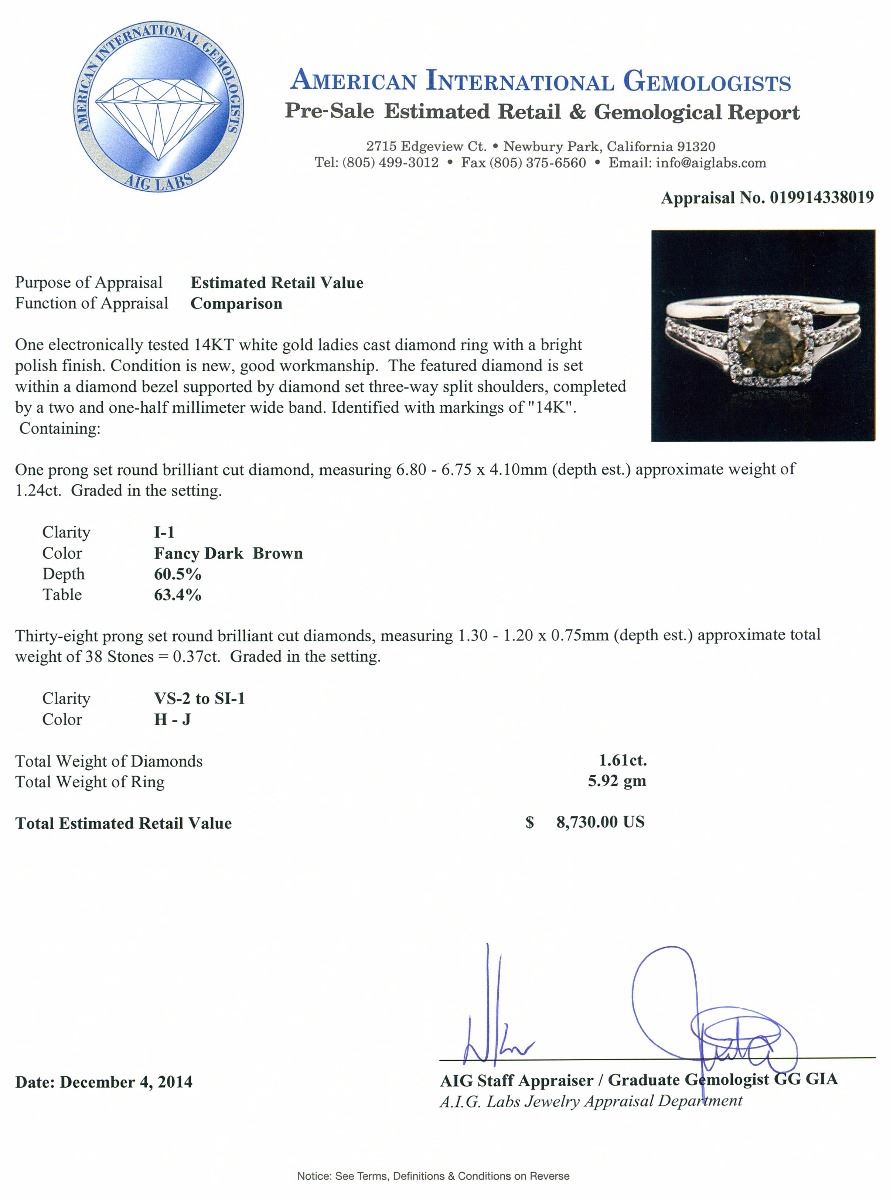 One electronically tested 14KT white gold ladies cast diamond ring with a bright polish finish. The featured diamond is set within a diamond bezel supported by diamond set three-way split shoulders, completed by a two and one-half millimeter wide band. Identified with markings of "14K". Condition is new, good workmanship. Containing: One prong set round brilliant cut diamond, measuring 6.80 - 6.75 x 4.10mm (depth est.) approximate weight of 1.24ct. Graded in the setting. Clarity: I-1. Depth: 60.5%. Table 63.4%. Thirty-Eight prong set round brilliant cut diamonds, measuring 1.30 - 1.20 x 0.75mm (depth est.) approximate total weight of 38 Stones = 0.37ct. Graded in the setting. Clarity: VS-2 to SI-1. Color: H - J. Total Weight of Diamonds 1.61ct. Total Weight of Ring 5.92 grams. AIG Appraised at $8,730.00.