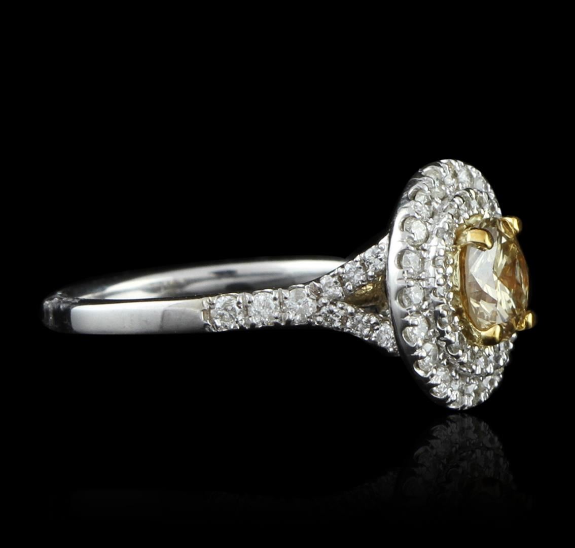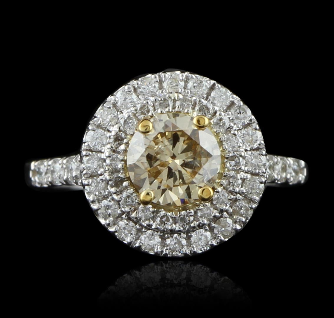One electronically tested 14KT white gold ladies cast & assembled diamond ring with a bright polish finish. Condition is good. The featured diamond is set within a yellow gold basket and placed within tiered diamond bezels. The ring is supported by split diamond set shoulders, completed by a one and one-half millimeter wide band. Identified with markings of "14K". Containing: One prong set round brilliant cut diamond, measuring 6.30 - 6.30 x 3.80mm (depth est.) approximate weight of 0.94ct. Faint brown secondary color throughout. Graded in the setting. Clarity I-1. Color Light Yellow. Depth 60.3%. Table 65.1%. Fifty-six prong set round brilliant cut diamonds, measuring 1.60 - 1.30 x 0.87mm (depth est.) approximate total weight of 56 Stones = 0.67ct. Graded in the setting. Clarity I-1 to 1-2. Color G -- I. Total Weight of Diamonds 1.61ct. Total Weight of Ring 4.11gm. AIG Appraised at $8,455.00.