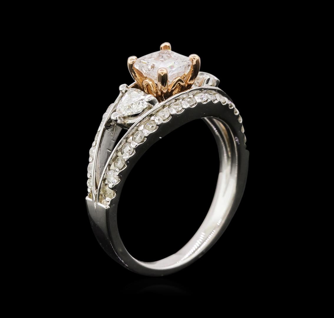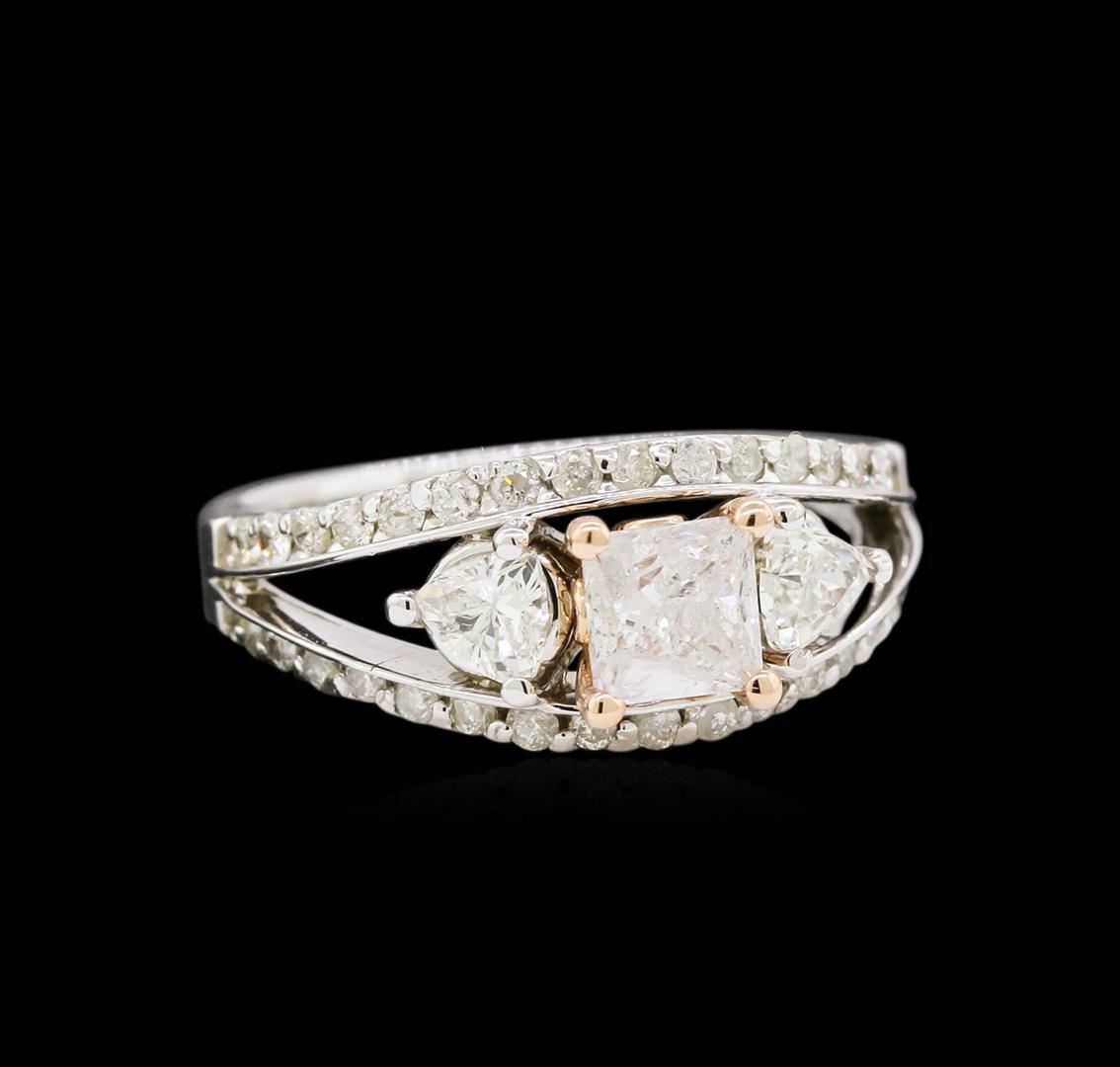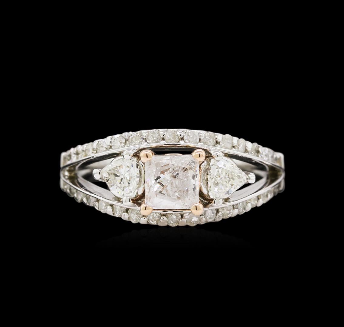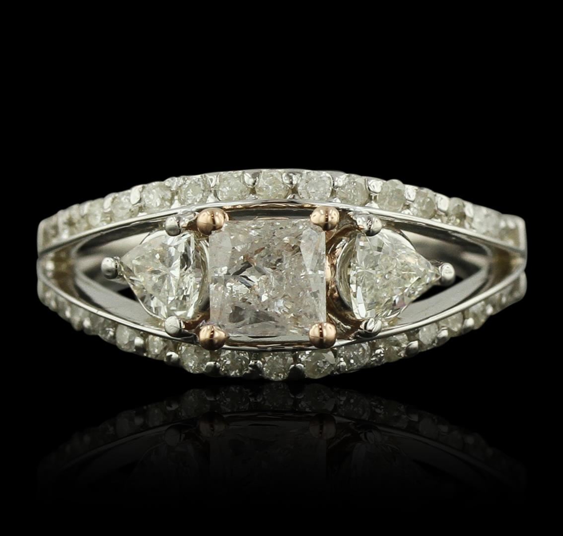 One electronically tested 14KT white gold ladies cast & assembled diamond unity ring with a bright polish finish. Condition is new, good workmanship. The featured diamond is set within a rose gold basket accented by a single diamond on either side and supported by mirroring diamond ribbons. The ring is completed by a two millimeter wide band. Identified with markings of "K14". Containing: One prong set princess cut diamond, measuring 4.70 x 4.65 x 3.50mm (depth est.) approximate weight of 0.72ct. Naturally occurring internal & external characteristics are present, including natural iridescence. Graded in the setting. Clarity: I-2. Color: 75.3%. Table 76.3%. Two prong set triangle brilliant cut diamonds, measuring 3.80 x 3.70 x 2.30mm (depth est.) approximate. Total Weight of 2 Stones = 0.40ct. Graded in the setting. Clarity: VS-1 to VS-2. Color: H - I Thirty-Four prong set round brilliant cut diamonds, measuring 1.50 - 1.40 x 0.87mm (depth est.) approximate. Total Weight of 34 Stones = 0.49ct. Graded in the setting. Clarity: I-1 to I-2. Color: H - J. Total Weight of Diamonds 1.61ct. Total Weight of Ring 5.05 grams. AIG Appraised at $7,955.00.