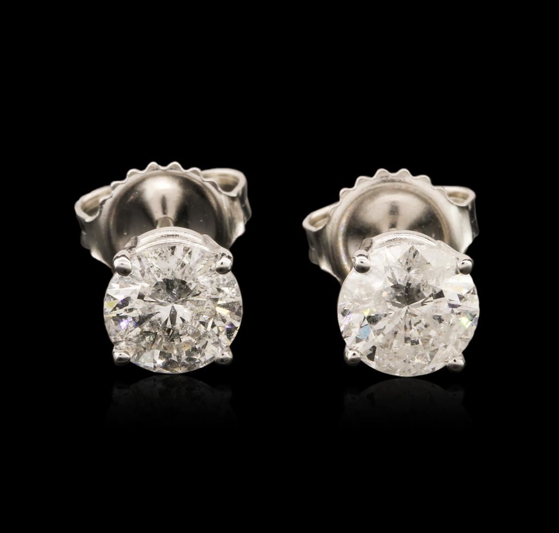 One pair electronically tested 14KT white gold ladies cast diamond stud earrings with friction posts with a bright polish finish. Condition is new. Containing: One prong set round brilliant cut diamond, measuring 6.12 - 6.07 x 3.67mm (depth est.) approximate weight of 0.83ct. Clarity: I-3. Color: H, Cut is Good. One prong set round brilliant cut diamond, measuring 5.98 - 5.96 x 3.58mm (depth est.) approximate weight of 0.78ct. Clarity: I-3. Color: H, Cut is Good. All diamonds are graded in the mounting, unless otherwise stated. Total Weight of Diamonds 1.61ct. Total Weight of Stud Earrings 1.30 grams. GGL Appraised at $4,245.00.