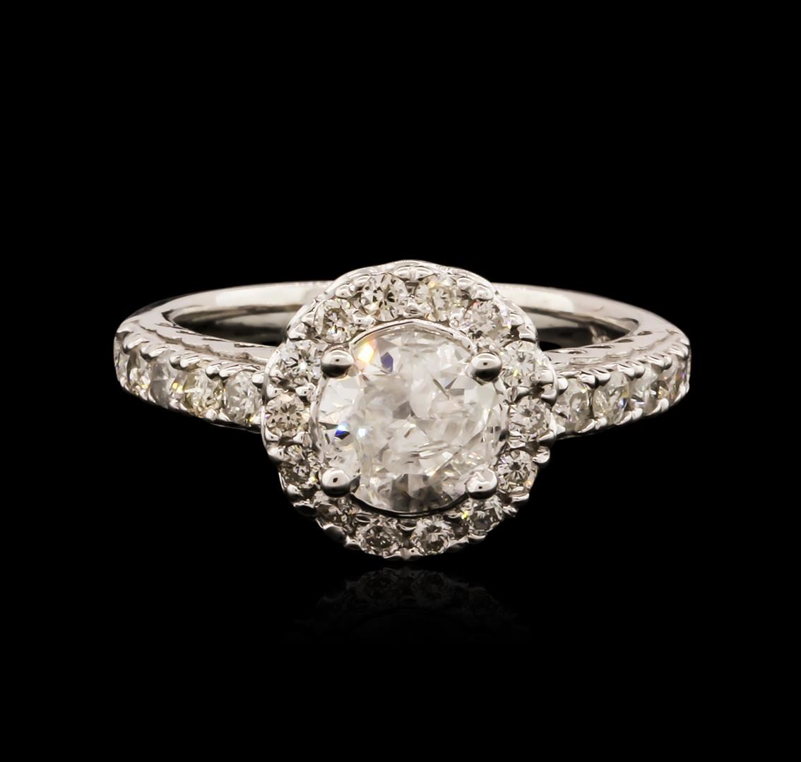 One electronically tested 14KT white gold ladies cast diamond engagement ring with a bright polish finish. Identified with markings of "14K". Condition is new. Containing: One prong set round brilliant cut diamond, measuring 6.80 - 6.80 x 4.08mm (depth est.) approximate weight of 1.15ct. Clarity: I-3. Color: J, Cut is Good. Twenty-Four prong set round brilliant cut diamonds, measuring 2.00 - 1.50 x 1.05mm (depth est.) approximate total weight of 24 Stones = 0.47ct. Clarity: SI-1 to SI-2. Color: J - K, Cut is Good. All diamonds are graded in the mounting, unless otherwise stated. Total Weight of Diamonds 1.62ct. Total Weight of Engagement Ring 4.10 grams. GGL Appraised at $5,170.00.