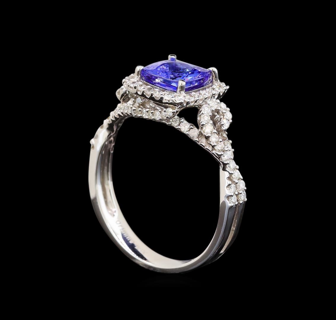 One electronically tested 14KT white gold ladies cast tanzanite and diamond ring with a flat shank with a bright polish finish. Trademark is Orianne. Identified with markings of "14K". Condition is new. Containing: One prong set square cushion modified brilliant cut natural tanzanite, measuring 6.64 x 6.65 x 4.66mm, approximate weight of 1.62ct., clarity is eye clean, type I, medium light, very slightly grayish, violet color, (GIA V 4/3), cut is good. Ninety-Two prong set round brilliant cut diamonds, measuring 1.00 - 1.00 x 0.60mm (depth est.) approximate total weight of 92 Stones = 0.33ct. Clarity: I-1 to I-2. Color: I - J. All diamonds and colored gemstones are graded in the mounting, unless otherwise stated. Colored gemstones are presumed to have been subjected to commonly used enhancement processes.. Total Weight of Colored Stones 1.62ct. Total Weight of Diamonds 0.33ct. Total Weight of Ring 3.50 grams. GGL Appraised at $3,150.00.