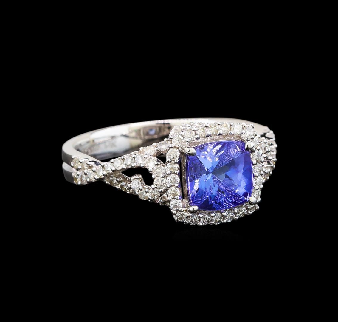 One electronically tested 14KT white gold ladies cast tanzanite and diamond ring with a flat shank with a bright polish finish. Trademark is Orianne. Identified with markings of "14K". Condition is new. Containing: One prong set square cushion modified brilliant cut natural tanzanite, measuring 6.64 x 6.65 x 4.66mm, approximate weight of 1.62ct., clarity is eye clean, type I, medium light, very slightly grayish, violet color, (GIA V 4/3), cut is good. Ninety-Two prong set round brilliant cut diamonds, measuring 1.00 - 1.00 x 0.60mm (depth est.) approximate total weight of 92 Stones = 0.33ct. Clarity: I-1 to I-2. Color: I - J. All diamonds and colored gemstones are graded in the mounting, unless otherwise stated. Colored gemstones are presumed to have been subjected to commonly used enhancement processes.. Total Weight of Colored Stones 1.62ct. Total Weight of Diamonds 0.33ct. Total Weight of Ring 3.50 grams. GGL Appraised at $3,150.00.