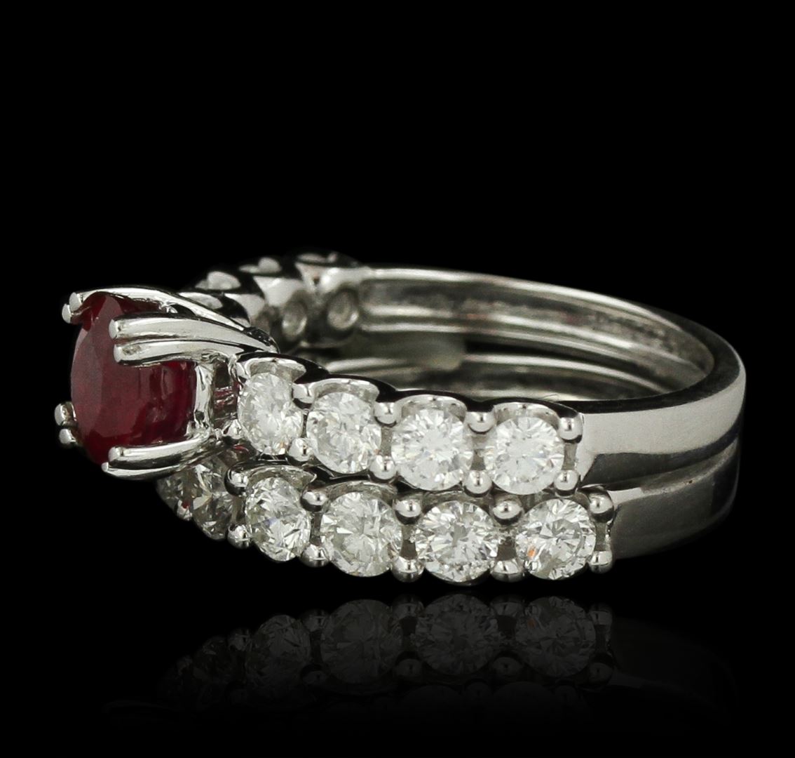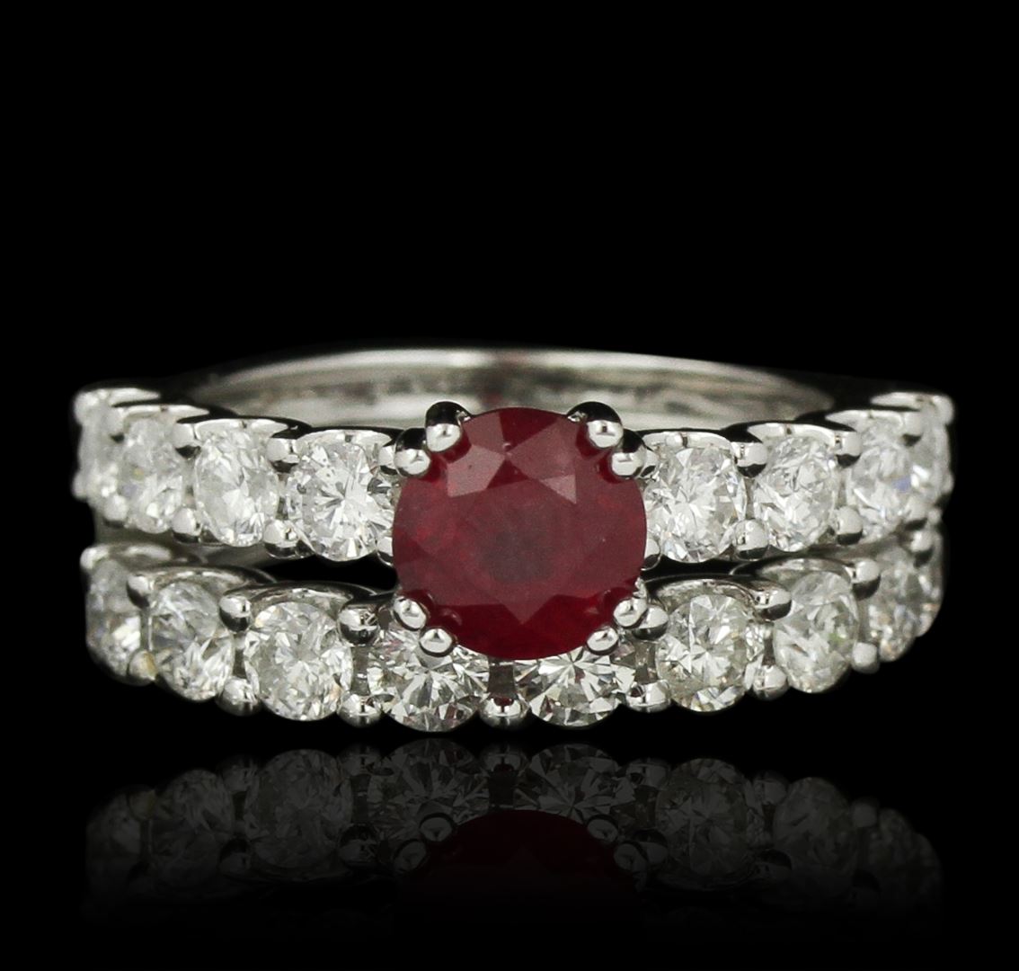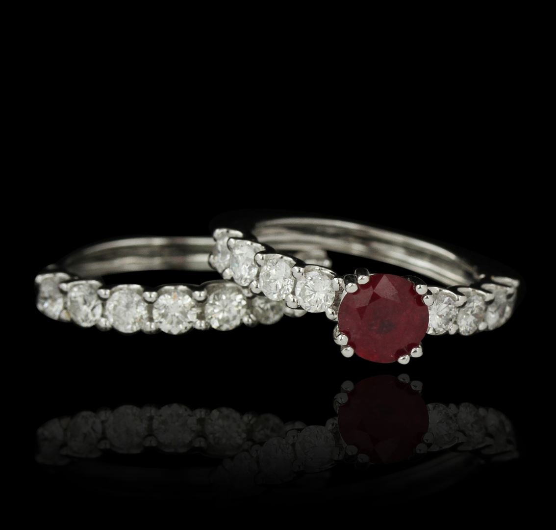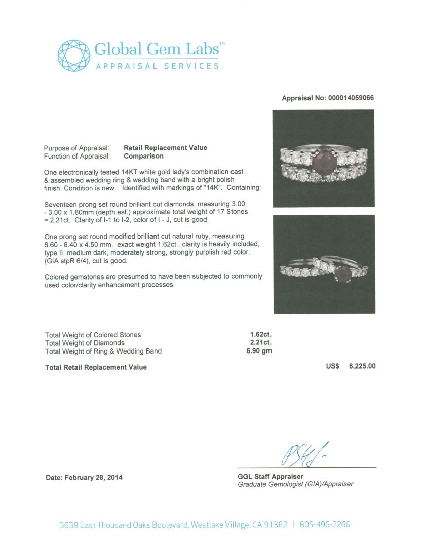 One electronically tested 14KT white gold Ladies combination cast & assembled wedding ring & wedding band with a bright polish finish. Condition is new. Identified with markings of "14K". Containing: Seventeen prong set round brilliant cut diamonds, measuring 3.00 - 3.00 x 1.80mm (depth est.) approximate. Total Weight of 17 Stones = 2.21ct. Clarity: I-1 to I-2. Color: I - J, Cut is Good. One prong set round modified brilliant cut natural ruby, measuring 6.60 - 6.40 x 4.50 mm, exact weight 1.62ct., clarity is heavily included, type II, medium dark, moderately strong, strongly purplish red color, (GIA stpR 6/4), cut is good. Colored gemstones are presumed to have been subjected to commonly used color/clarity enhancement processes. Total Weight of Colored Stones 1.62ct. Total Weight of Diamonds 2.21ct. Total Weight of Ring & Wedding Band 6.90 grams. GGL Appraised at $6,225.00.