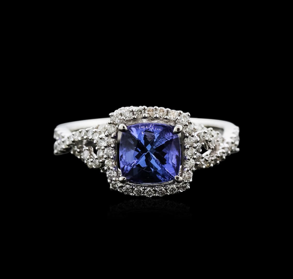 One electronically tested 14KT white gold ladies cast tanzanite and diamond ring with a flat shank with a bright polish finish. Trademark is Orianne. Identified with markings of "14K". Condition is new. Containing: One prong set square cushion modified brilliant cut natural tanzanite, measuring 6.64 x 6.65 x 4.66mm, approximate weight of 1.62ct., clarity is eye clean, type I, medium light, very slightly grayish, violet color, (GIA V 4/3), cut is good. Ninety-Two prong set round brilliant cut diamonds, measuring 1.00 - 1.00 x 0.60mm (depth est.) approximate total weight of 92 Stones = 0.33ct. Clarity: I-1 to I-2. Color: I - J. All diamonds and colored gemstones are graded in the mounting, unless otherwise stated. Colored gemstones are presumed to have been subjected to commonly used enhancement processes.. Total Weight of Colored Stones 1.62ct. Total Weight of Diamonds 0.33ct. Total Weight of Ring 3.50 grams. GGL Appraised at $3,150.00.