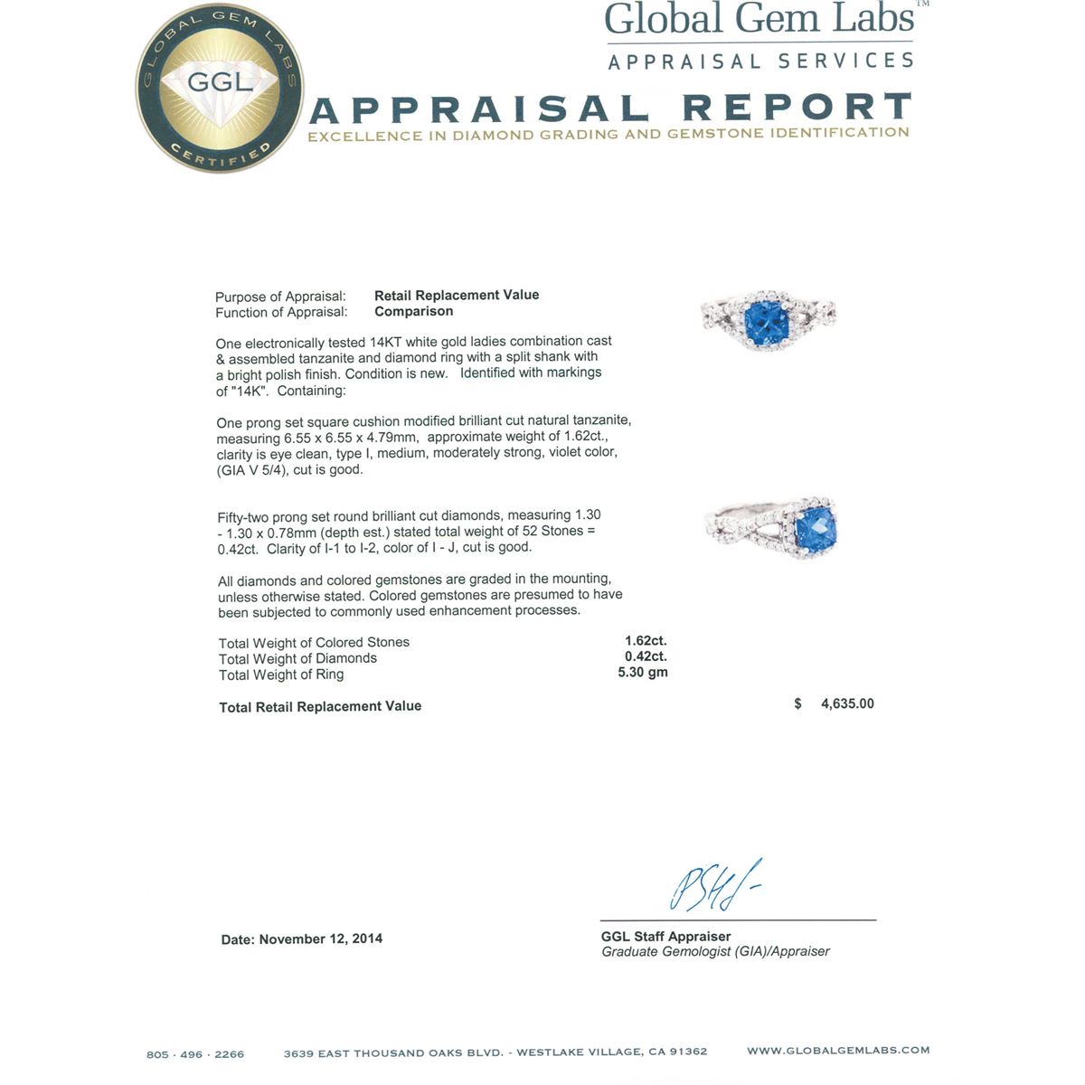 One electronically tested 14KT white gold ladies combination cast & assembled tanzanite and diamond ring with a split shank with a bright polish finish. Identified with markings of "14K". Condition is new. Containing: One prong set square cushion modified brilliant cut natural tanzanite, measuring 6.55 x 6.55 x 4.79mm, approximate weight of 1.62ct., clarity is eye clean, type I, medium, moderately strong, violet color, (GIA V 5/4), cut is good. Fifty-Two prong set round brilliant cut diamonds, measuring 1.30 - 1.30 x 0.78mm (depth est.) stated. Total Weight of 52 Stones = 0.42ct. Clarity: I-1 to I-2. Color: I - J, Cut is Good. All diamonds and colored gemstones are graded in the mounting, unless otherwise stated. Colored gemstones are presumed to have been subjected to commonly used enhancement processes. Total Weight of Colored Stones 1.62ct. Total Weight of Diamonds 0.42ct. Total Weight of Ring 5.30 grams. GGL Appraised at $4,635.00.