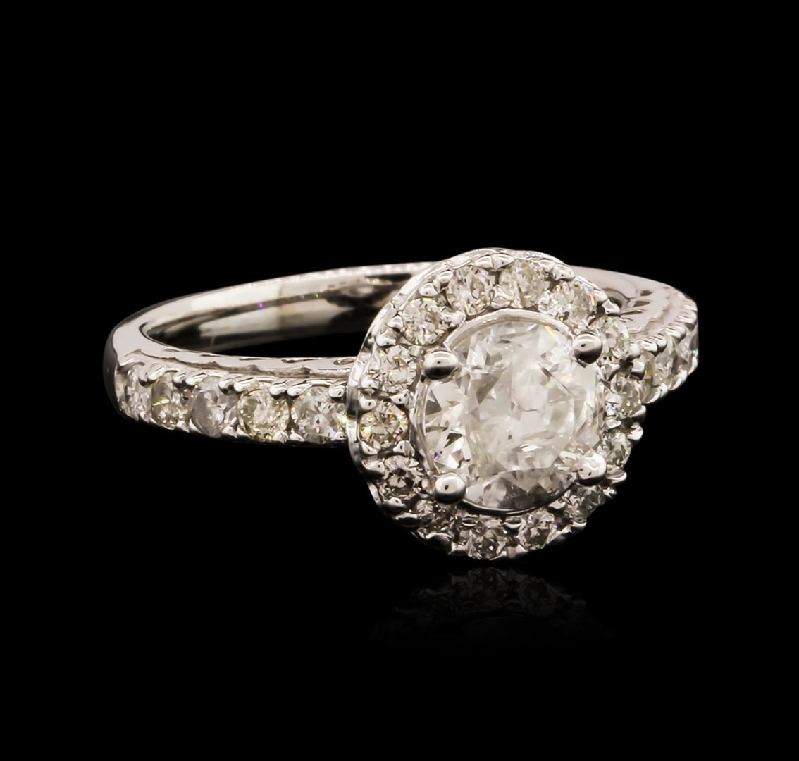 One electronically tested 14KT white gold ladies cast diamond engagement ring with a bright polish finish. Identified with markings of "14K". Condition is new. Containing: One prong set round brilliant cut diamond, measuring 6.80 - 6.80 x 4.08mm (depth est.) approximate weight of 1.15ct. Clarity: I-3. Color: J, Cut is Good. Twenty-Four prong set round brilliant cut diamonds, measuring 2.00 - 1.50 x 1.05mm (depth est.) approximate total weight of 24 Stones = 0.47ct. Clarity: SI-1 to SI-2. Color: J - K, Cut is Good. All diamonds are graded in the mounting, unless otherwise stated. Total Weight of Diamonds 1.62ct. Total Weight of Engagement Ring 4.10 grams. GGL Appraised at $5,170.00.