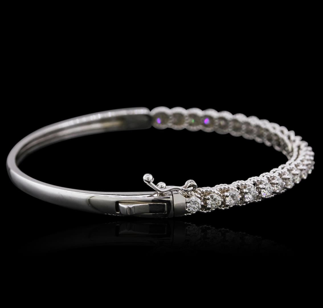 One electronically tested 14KT white gold ladies cast diamond bangle bracelet with a hidden box clasp with safety closer with a bright polish finish. Identified with markings of "14K". Condition is new. Containing: Twenty-Five prong set round brilliant cut diamonds, measuring 2.50 - 2.50 x 1.50mm (depth est.) approximate total weight of 25 Stones = 1.63ct. Clarity: SI-1 to SI-2. Color: H - I, Cut is Good. All diamonds are graded in the mounting, unless otherwise stated. Total Weight of Diamonds 1.63ct. Total Weight of Bangle Bracelet 10.70 grams. GGL Appraised at $5,015.00.