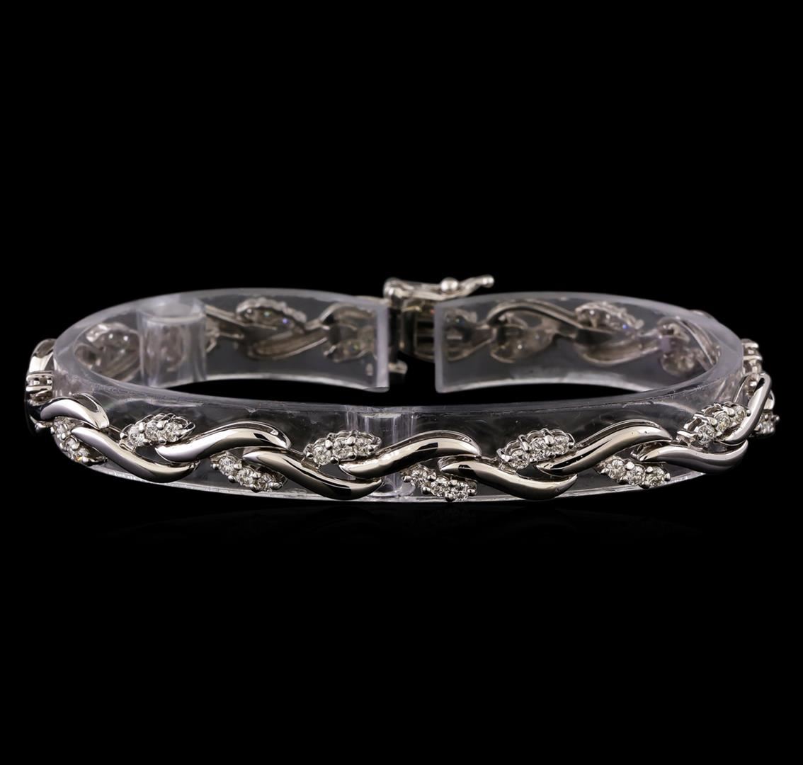 One electronically tested 14KT white gold ladies combination cast & assembled diamond bracelet with a hidden box clasp with safety closer with a bright polish finish. Measurements: 7 in length. Condition is new. Containing: Sixty prong set round brilliant cut diamonds, measuring 2.00 - 1.90 x 1.17mm (depth est.) approximate total weight of 60 Stones = 1.63ct. Clarity: SI-2. Color: I - J, Cut is Good. All diamonds are graded in the mounting, unless otherwise stated. Total Weight of Diamonds 1.63ct. Total Weight of Bracelet 12.20 grams. GGL Appraised at $6,140.00.