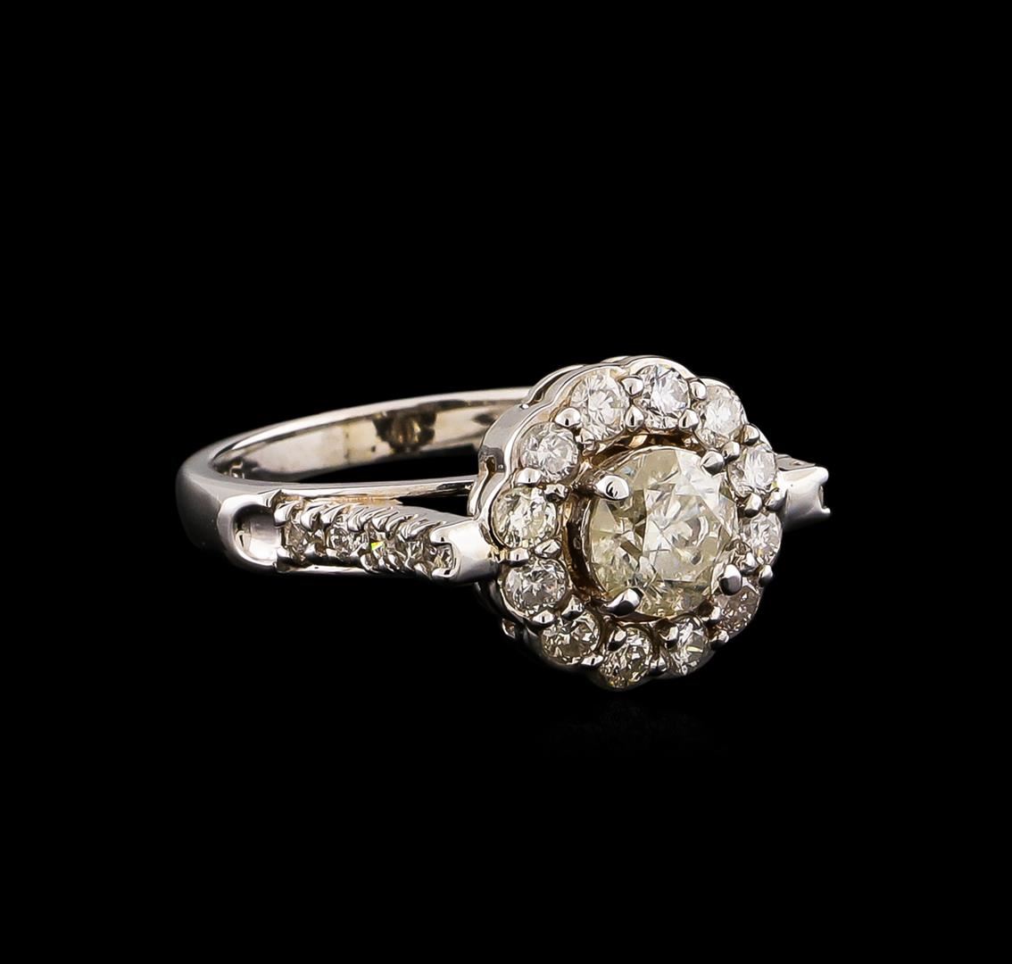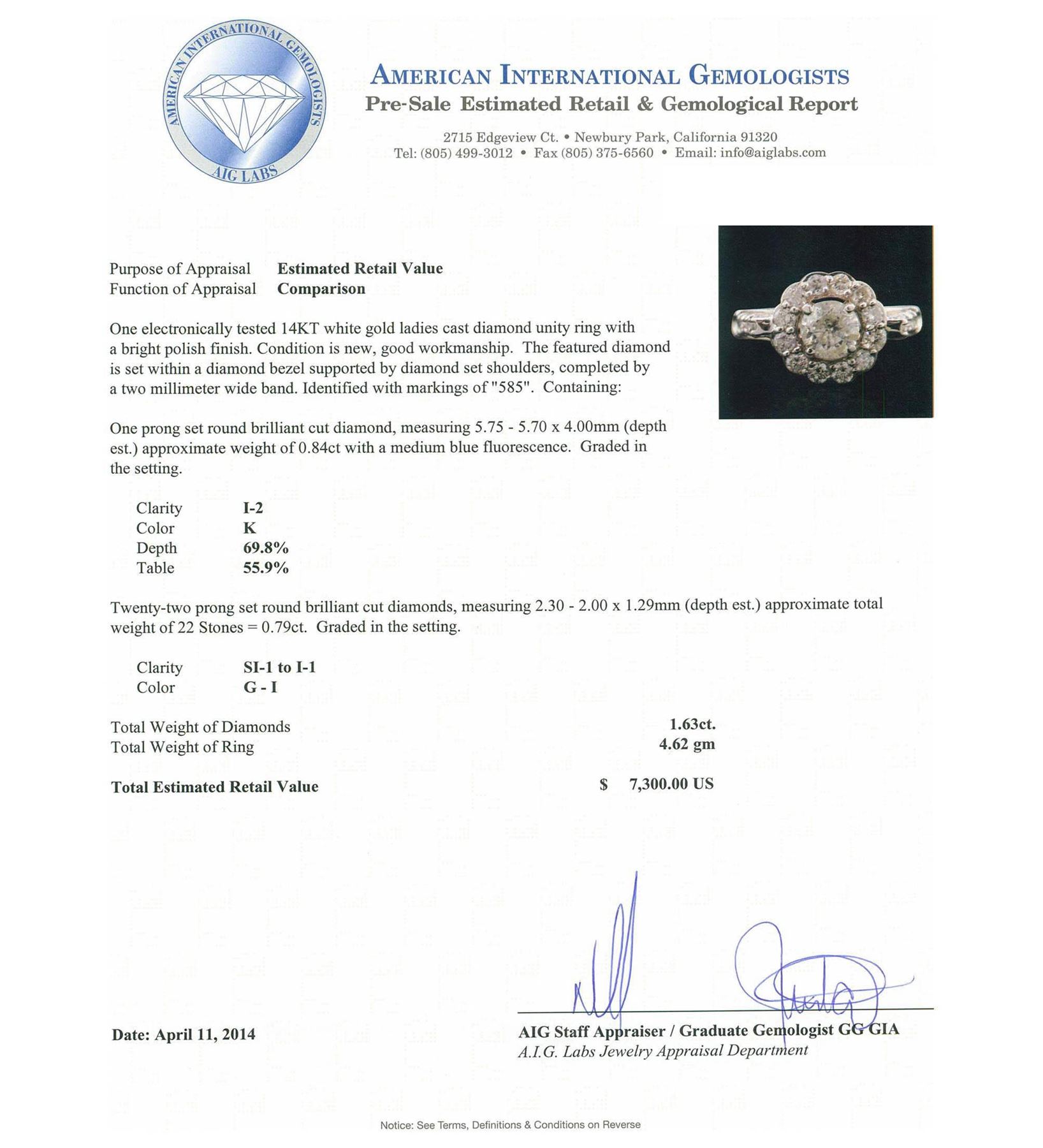 One electronically tested 14KT white gold ladies cast diamond unity ring with a bright polish finish. Condition is new, good workmanship. The featured diamond is set within a diamond bezel supported by diamond set shoulders, completed by a two millimeter wide band. Identified with markings of "585". Containing: One prong set round brilliant cut diamond, measuring 5.75 - 5.70 x 4.00mm (depth est.) approximate weight of 0.84ct with a medium blue fluorescence. Graded in the setting. Clarity: I-2. Color: 69.8%. Table 55.9%. Twenty-Two prong set round brilliant cut diamonds, measuring 2.30 - 2.00 x 1.29mm (depth est.) approximate. Total Weight of 22 Stones = 0.79ct. Graded in the setting. Clarity: SI-1 to I-1. Color: G - I. Total Weight of Diamonds 1.63ct. Total Weight of Ring 4.62 grams. AIG Appraised.