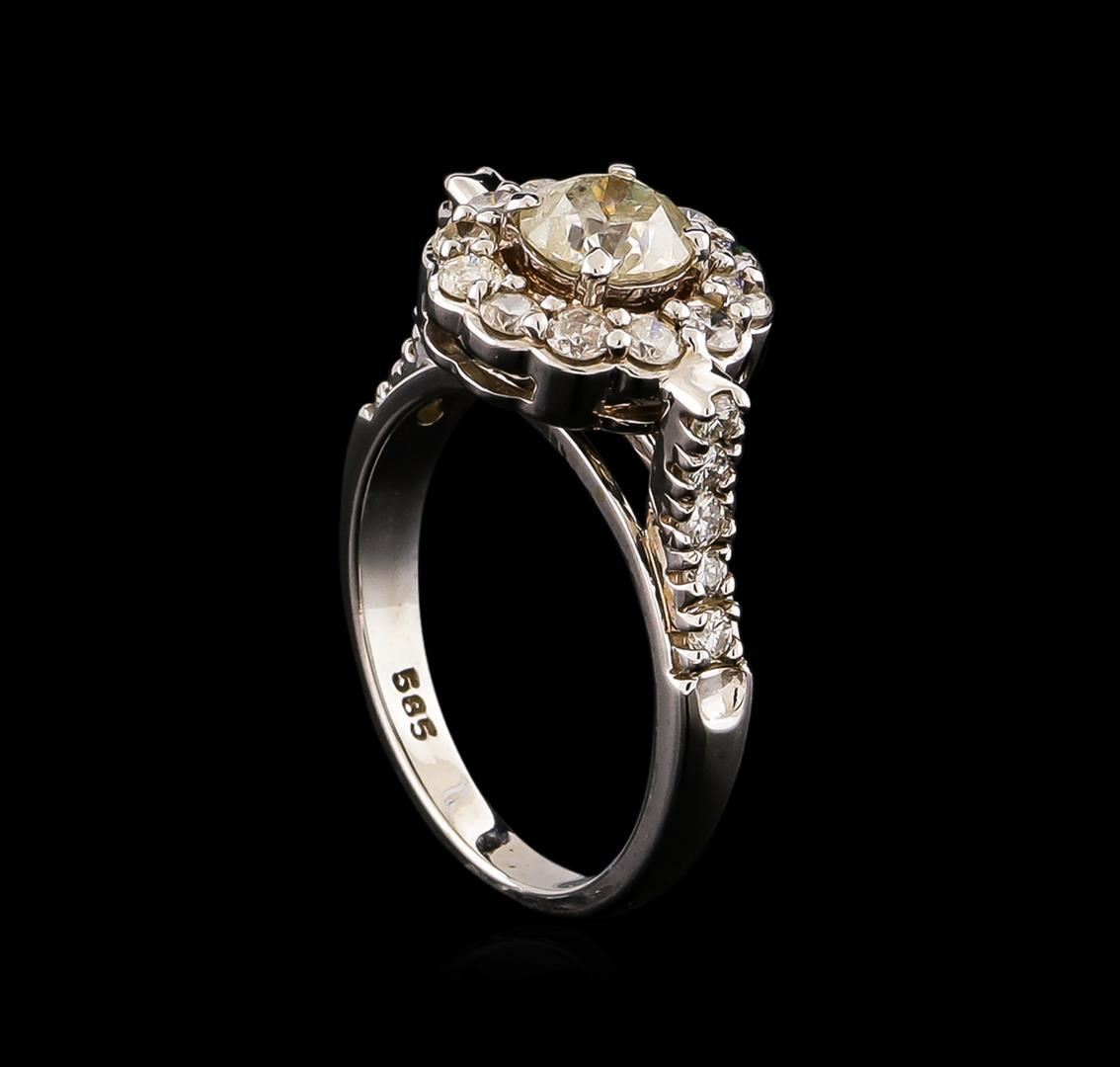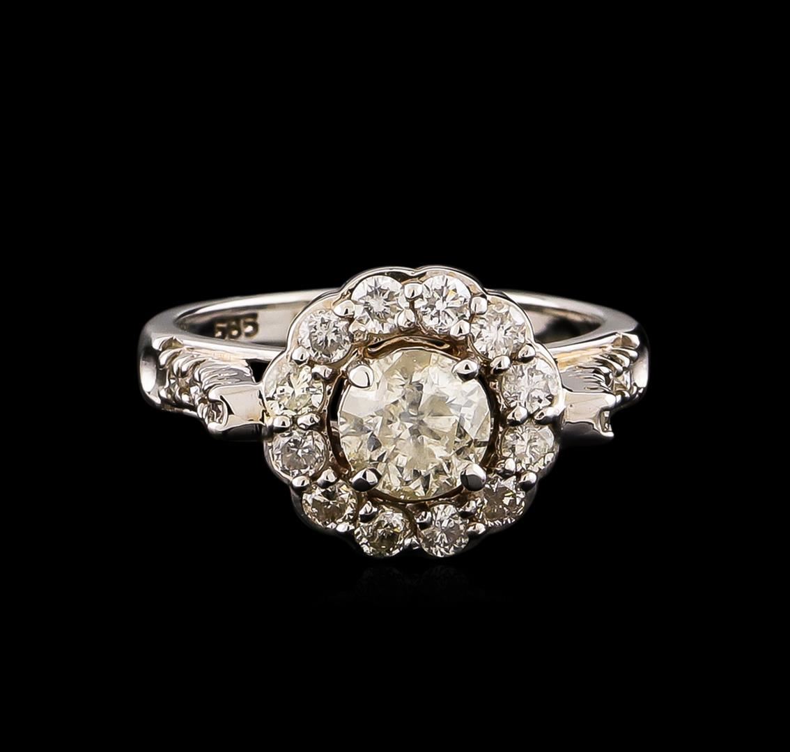 One electronically tested 14KT white gold ladies cast diamond unity ring with a bright polish finish. Condition is new, good workmanship. The featured diamond is set within a diamond bezel supported by diamond set shoulders, completed by a two millimeter wide band. Identified with markings of "585". Containing: One prong set round brilliant cut diamond, measuring 5.75 - 5.70 x 4.00mm (depth est.) approximate weight of 0.84ct with a medium blue fluorescence. Graded in the setting. Clarity: I-2. Color: 69.8%. Table 55.9%. Twenty-Two prong set round brilliant cut diamonds, measuring 2.30 - 2.00 x 1.29mm (depth est.) approximate. Total Weight of 22 Stones = 0.79ct. Graded in the setting. Clarity: SI-1 to I-1. Color: G - I. Total Weight of Diamonds 1.63ct. Total Weight of Ring 4.62 grams. AIG Appraised.