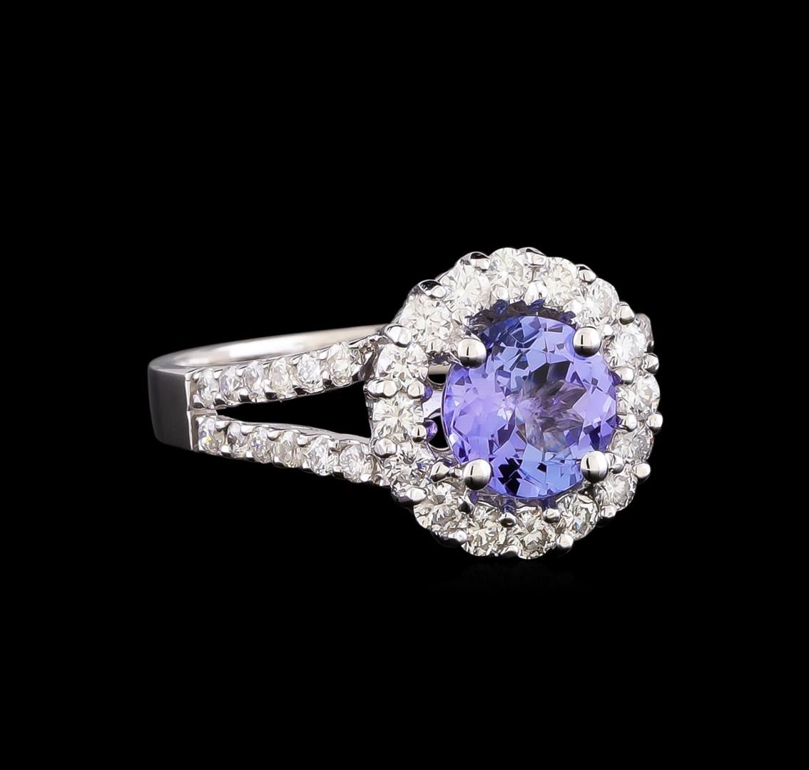 One electronically tested 14KT white gold ladies combination cast & assembled tanzanite and diamond ring with a flat shank with a bright polish finish. Identified with markings of "14K". Condition is new. Containing: One prong set round modified brilliant cut natural tanzanite, measuring 7.11 - 7.11 x 4.82 mm, approximate weight of 1.63ct., clarity is eye clean, type I, medium light, very slightly grayish, violet color, (GIA V 4/3), cut is good. Forty prong set round brilliant cut diamonds, measuring 1.80 - 1.50 x 0.99mm (depth est.) approximate total weight of 40 Stones = 0.66ct. Clarity: SI-2 to I-1. Color: H - I, Cut is Good. Colored gemstones are presumed to have been subjected to commonly used enhancement processes. All diamonds and colored gemstones are graded in the mounting, unless otherwise stated. Total Weight of Colored Stones 1.63ct. Total Weight of Diamonds 0.66ct. Total Weight of Ring 4.90 grams. GGL Appraised at $4,190.00.