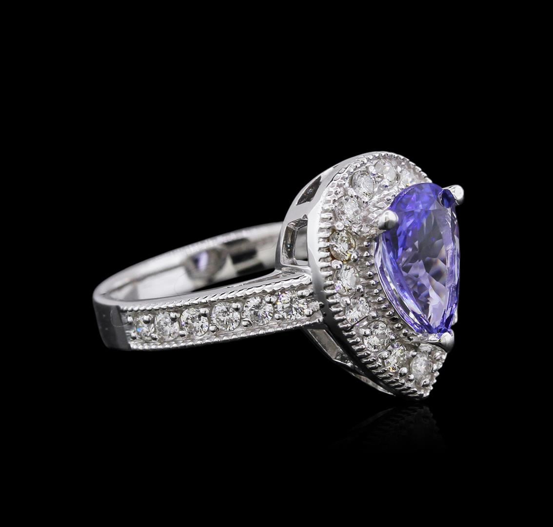 One electronically tested 14KT white gold ladies cast tanzanite and diamond ring with a bright polish finish. Identified with markings of "14K". Condition is new. Containing: One prong set pear modified brilliant cut natural tanzanite, measuring 9.00 x 6.83 x 3.95mm, approximate weight of 1.63ct., clarity is eye clean, type I, medium, very slightly grayish, violet color, (GIA V 5/3), cut is good. Twenty-Seven prong set round brilliant cut diamonds, measuring 1.50 - 1.50 x 0.90mm (depth est.) approximate total weight of 27 Stones = 0.33ct. Clarity: SI-2 to I-1. Color: I - J, Cut is Good. All diamonds and colored gemstones are graded in the mounting, unless otherwise stated. Colored gemstones are presumed to have been subjected to commonly used enhancement processes. Total Weight of Colored Stones 1.63ct. Total Weight of Diamonds 0.33ct. Total Weight of Ring 5.30 grams. GGL Appraised at $2,635.00.