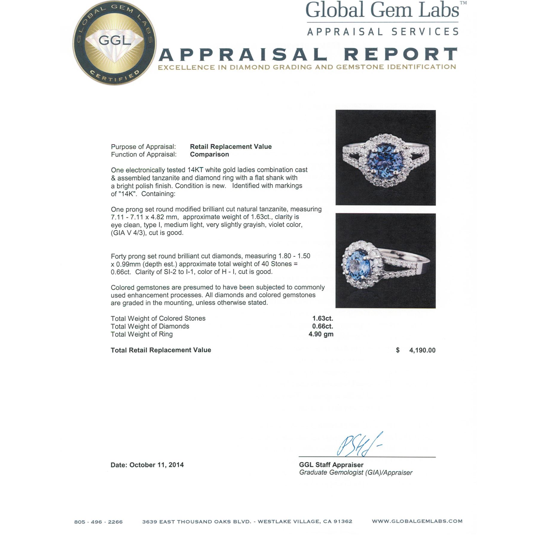 One electronically tested 14KT white gold ladies combination cast & assembled tanzanite and diamond ring with a flat shank with a bright polish finish. Identified with markings of "14K". Condition is new. Containing: One prong set round modified brilliant cut natural tanzanite, measuring 7.11 - 7.11 x 4.82 mm, approximate weight of 1.63ct., clarity is eye clean, type I, medium light, very slightly grayish, violet color, (GIA V 4/3), cut is good. Forty prong set round brilliant cut diamonds, measuring 1.80 - 1.50 x 0.99mm (depth est.) approximate total weight of 40 Stones = 0.66ct. Clarity: SI-2 to I-1. Color: H - I, Cut is Good. Colored gemstones are presumed to have been subjected to commonly used enhancement processes. All diamonds and colored gemstones are graded in the mounting, unless otherwise stated. Total Weight of Colored Stones 1.63ct. Total Weight of Diamonds 0.66ct. Total Weight of Ring 4.90 grams. GGL Appraised at $4,190.00.