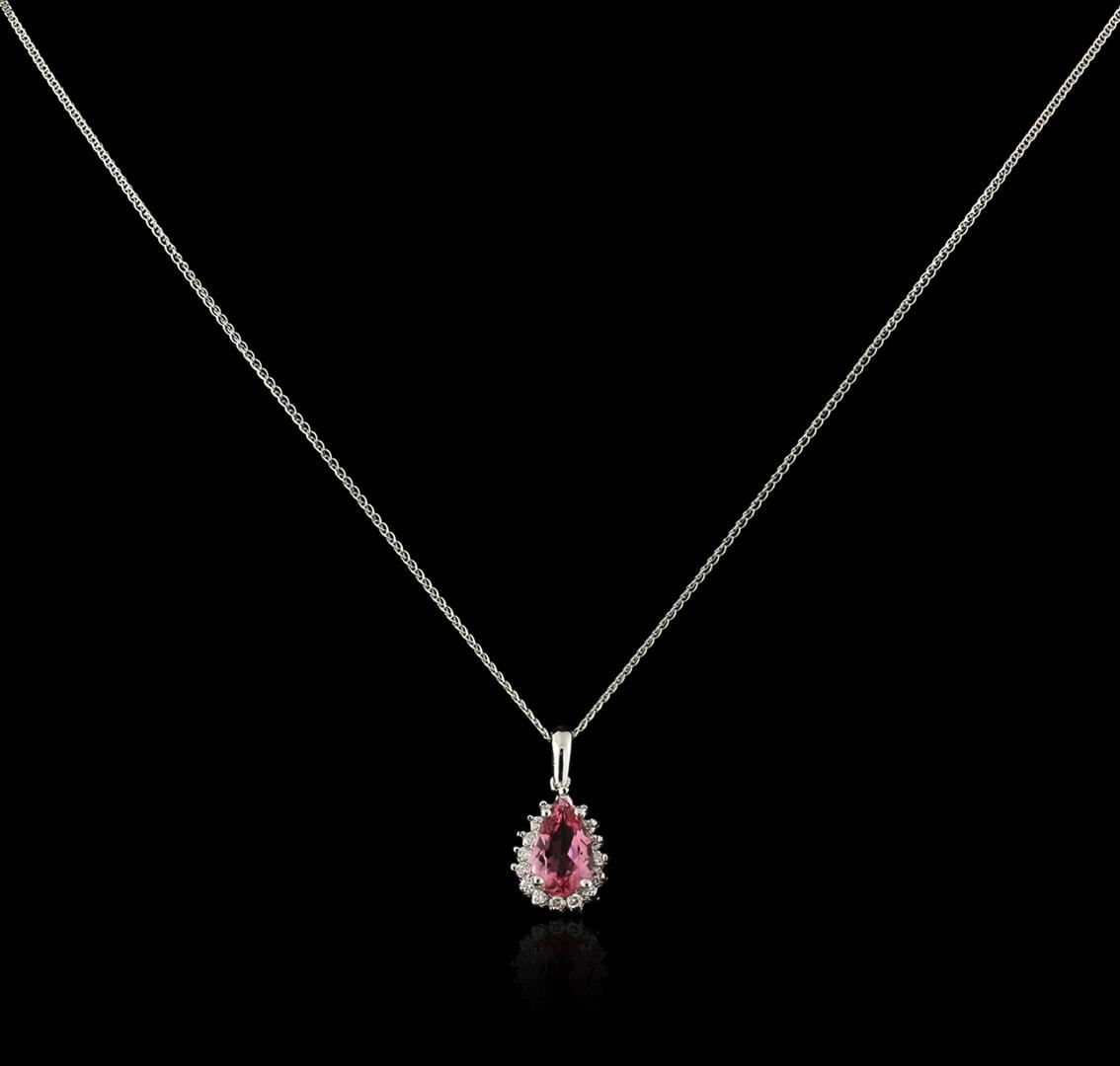 One electronically tested 14KT white gold ladies cast topaz and diamond pendant & chain 16.0" long, with a spring ring clasp with a bright polish finish. Identified with markings of "14K". Condition is new. Containing: One prong set pear modified brilliant cut natural pink topaz, measuring 11.00 x 7.00 x 4.55mm, approximate weight of 1.63ct., clarity is eye clean, type I, light, slightly brownish, strongly purplish red color, (GIA stpR 3/2), cut is good. Sixteen prong set round brilliant cut diamonds, measuring 1.60 - 1.60 x 0.96mm (depth est.) approximate total weight of 16 Stones = 0.30ct. Clarity: SI-1 to SI-2. Color: I - J, Cut is Good. Colored gemstones are presumed to have been subjected to commonly used enhancement processes. All diamonds and colored gemstones are graded in the mounting, unless otherwise stated. Total Weight of Colored Stones 1.63ct. Total Weight of Diamonds 0.30ct. Total Weight of Pendant & Chain 3.20 grams. GGL Appraised at $1,510.00.
