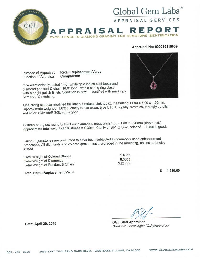One electronically tested 14KT white gold ladies cast topaz and diamond pendant & chain 16.0" long, with a spring ring clasp with a bright polish finish. Identified with markings of "14K". Condition is new. Containing: One prong set pear modified brilliant cut natural pink topaz, measuring 11.00 x 7.00 x 4.55mm, approximate weight of 1.63ct., clarity is eye clean, type I, light, slightly brownish, strongly purplish red color, (GIA stpR 3/2), cut is good. Sixteen prong set round brilliant cut diamonds, measuring 1.60 - 1.60 x 0.96mm (depth est.) approximate total weight of 16 Stones = 0.30ct. Clarity: SI-1 to SI-2. Color: I - J, Cut is Good. Colored gemstones are presumed to have been subjected to commonly used enhancement processes. All diamonds and colored gemstones are graded in the mounting, unless otherwise stated. Total Weight of Colored Stones 1.63ct. Total Weight of Diamonds 0.30ct. Total Weight of Pendant & Chain 3.20 grams. GGL Appraised at $1,510.00.