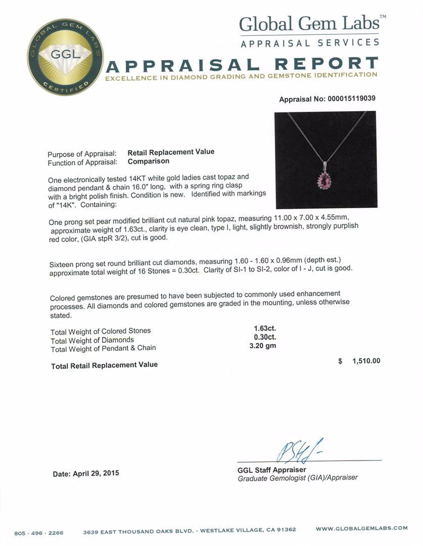 One electronically tested 14KT white gold ladies cast topaz and diamond pendant & chain 16.0" long, with a spring ring clasp with a bright polish finish. Identified with markings of "14K". Condition is new. Containing: One prong set pear modified brilliant cut natural pink topaz, measuring 11.00 x 7.00 x 4.55mm, approximate weight of 1.63ct., clarity is eye clean, type I, light, slightly brownish, strongly purplish red color, (GIA stpR 3/2), cut is good. Sixteen prong set round brilliant cut diamonds, measuring 1.60 - 1.60 x 0.96mm (depth est.) approximate total weight of 16 Stones = 0.30ct. Clarity: SI-1 to SI-2. Color: I - J, Cut is Good. Colored gemstones are presumed to have been subjected to commonly used enhancement processes. All diamonds and colored gemstones are graded in the mounting, unless otherwise stated. Total Weight of Colored Stones 1.63ct. Total Weight of Diamonds 0.30ct. Total Weight of Pendant & Chain 3.20 grams. GGL Appraised at $1,510.00.