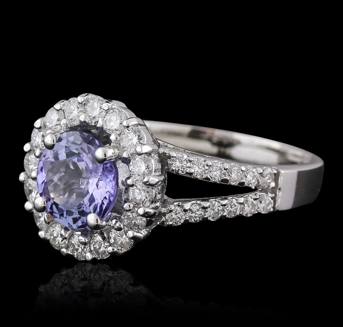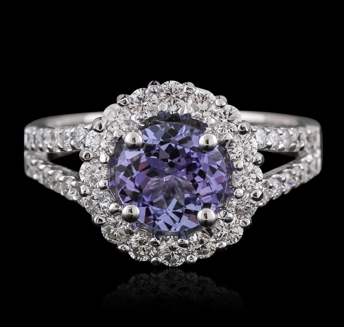 One electronically tested 14KT white gold ladies combination cast & assembled tanzanite and diamond ring with a flat shank with a bright polish finish. Identified with markings of "14K". Condition is new. Containing: One prong set round modified brilliant cut natural tanzanite, measuring 7.11 - 7.11 x 4.82 mm, approximate weight of 1.63ct., clarity is eye clean, type I, medium light, very slightly grayish, violet color, (GIA V 4/3), cut is good. Forty prong set round brilliant cut diamonds, measuring 1.80 - 1.50 x 0.99mm (depth est.) approximate total weight of 40 Stones = 0.66ct. Clarity: SI-2 to I-1. Color: H - I, Cut is Good. Colored gemstones are presumed to have been subjected to commonly used enhancement processes. All diamonds and colored gemstones are graded in the mounting, unless otherwise stated. Total Weight of Colored Stones 1.63ct. Total Weight of Diamonds 0.66ct. Total Weight of Ring 4.90 grams. GGL Appraised at $4,190.00.