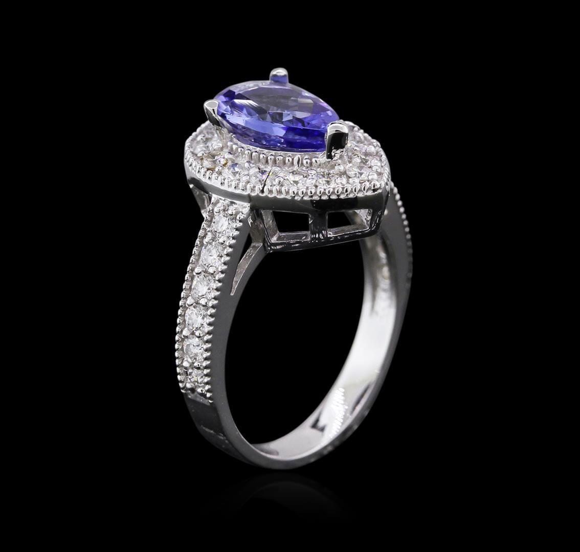 One electronically tested 14KT white gold ladies cast tanzanite and diamond ring with a bright polish finish. Identified with markings of "14K". Condition is new. Containing: One prong set pear modified brilliant cut natural tanzanite, measuring 9.00 x 6.83 x 3.95mm, approximate weight of 1.63ct., clarity is eye clean, type I, medium, very slightly grayish, violet color, (GIA V 5/3), cut is good. Twenty-Seven prong set round brilliant cut diamonds, measuring 1.50 - 1.50 x 0.90mm (depth est.) approximate total weight of 27 Stones = 0.33ct. Clarity: SI-2 to I-1. Color: I - J, Cut is Good. All diamonds and colored gemstones are graded in the mounting, unless otherwise stated. Colored gemstones are presumed to have been subjected to commonly used enhancement processes. Total Weight of Colored Stones 1.63ct. Total Weight of Diamonds 0.33ct. Total Weight of Ring 5.30 grams. GGL Appraised at $2,635.00.