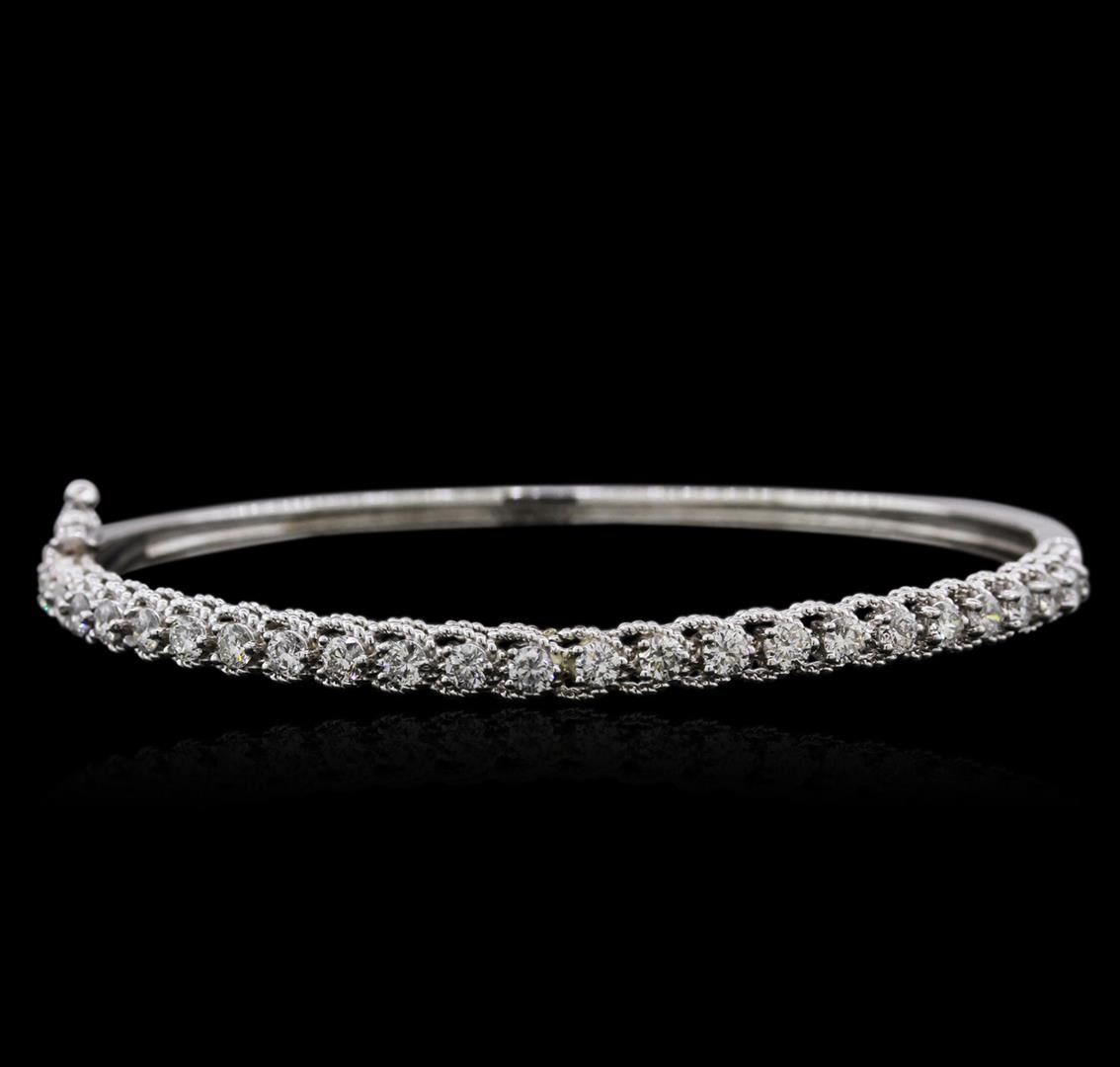 One electronically tested 14KT white gold ladies cast diamond bangle bracelet with a hidden box clasp with safety closer with a bright polish finish. Identified with markings of "14K". Condition is new. Containing: Twenty-Five prong set round brilliant cut diamonds, measuring 2.50 - 2.50 x 1.50mm (depth est.) approximate total weight of 25 Stones = 1.63ct. Clarity: SI-1 to SI-2. Color: H - I, Cut is Good. All diamonds are graded in the mounting, unless otherwise stated. Total Weight of Diamonds 1.63ct. Total Weight of Bangle Bracelet 10.70 grams. GGL Appraised at $5,015.00.