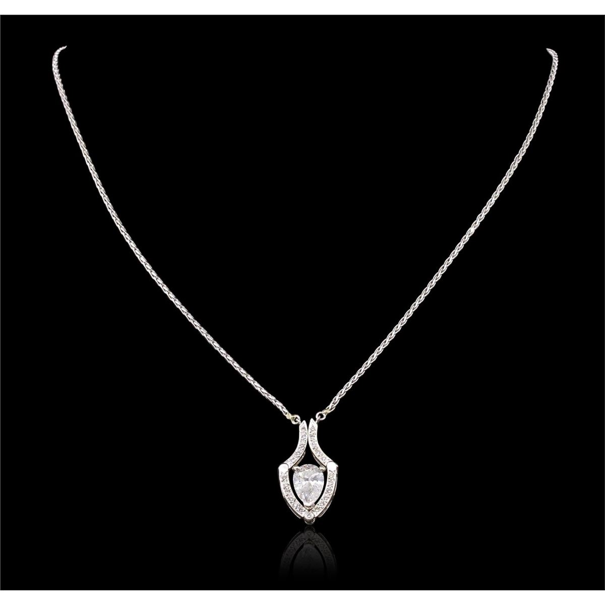 One electronically tested 14KT white gold ladies cast & assembled diamond pendant with chain. Condition is good. The pendant features the ability to be worn in two different ways. The first design features a pear shaped diamond set within a stylized diamond frame. While the second design features a ridged diamond set chevron design with a pear shaped diamond dangle. The pendant is supported by an attached sixteen inch length 14KT white gold designer style wheat chain, terminating in a spring ring clasp. Bright polish finish with milgrain detailing. Identified with markings of "14K". Containing: One prong set pear shaped cut diamond, measuring 9.30 x 6.35 x 3.78mm (depth est.) approximate weight of 1.43ct, laser drilled with a medium blue fluorescence. Graded in the setting. Clarity: I-1. Color: G Depth 59.5%. Table 58.3%. Twenty-Three bead & bezel set round brilliant cut diamonds, measuring 1.20 - 1.10 x 0.69mm (depth est.) approximate. Total Weight of 23 Stones = 0.20ct. Graded in the setting. Clarity: VS-1 to VS-2. Color: G - I. Total Weight of Diamonds 1.63ct. Total Weight of Pendant With Chain 7.38 grams. AIG Appraised at $15,625.00.