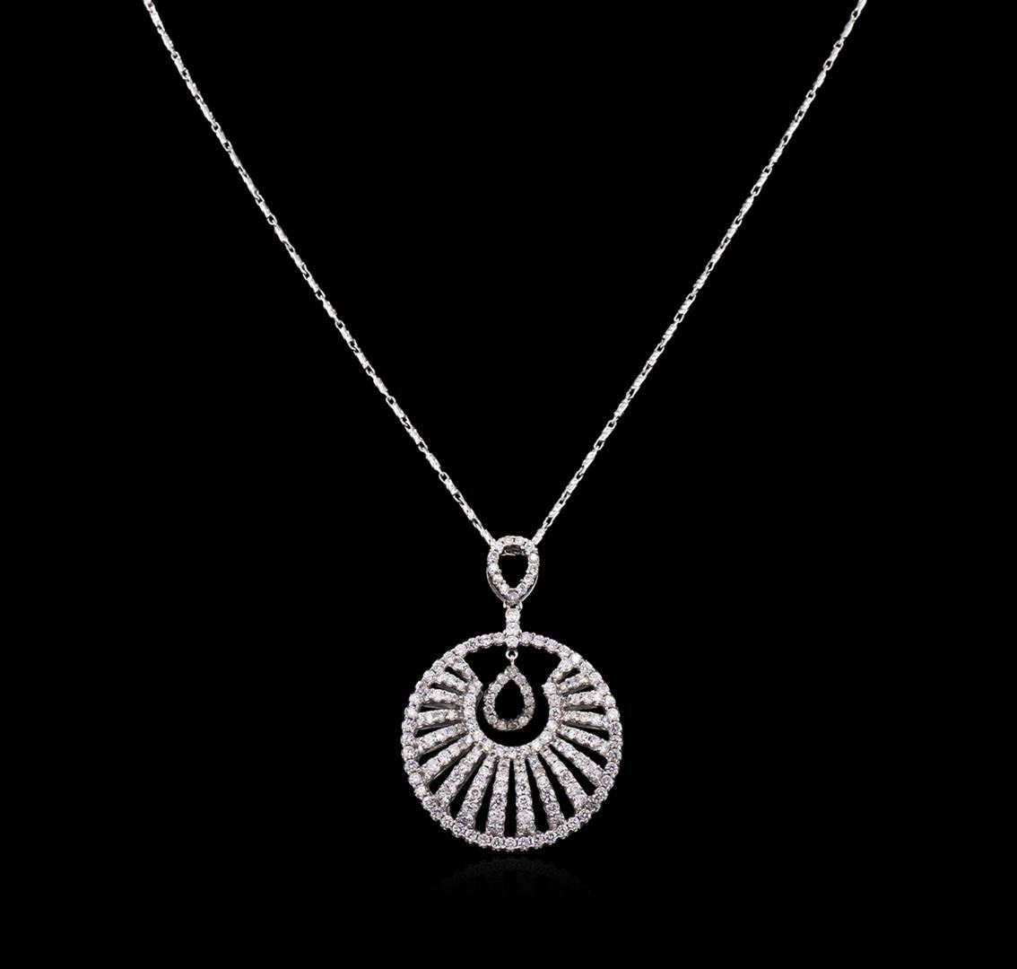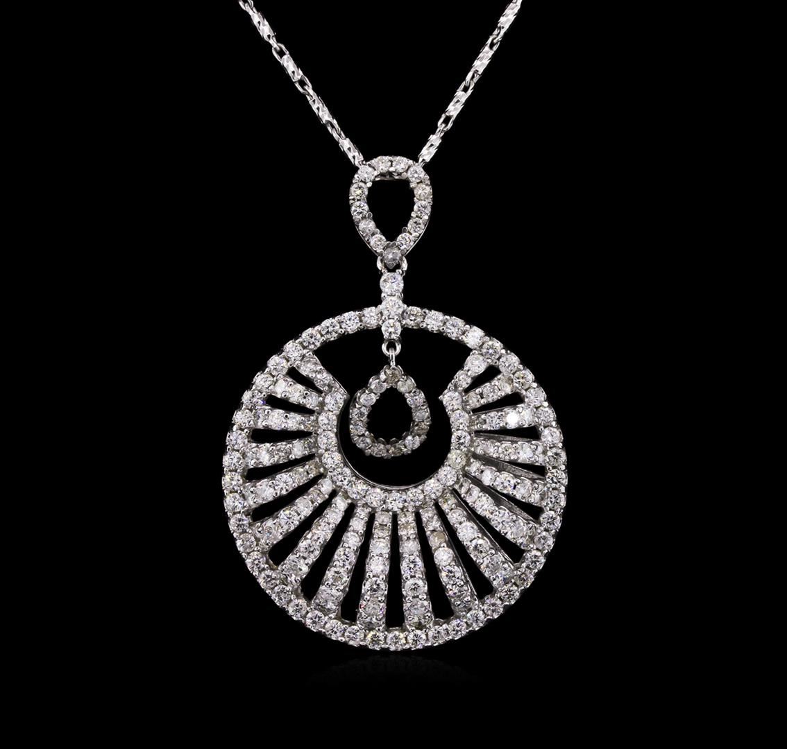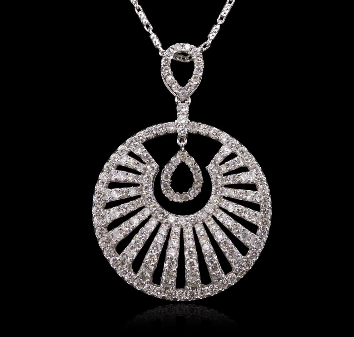 One electronically tested 14KT white gold Ladies combination cast & assembled pendant & chain 17.0" long, medium fancy link with a lobster claw clasp with a bright polish finish. Condition is new. Identified with markings of "14K". Containing: Ninety-One prong set round brilliant cut diamonds, measuring 1.90 - 1.50 x 1.02mm (depth est.) approximate. Total Weight of 91 Stones = 1.63ct. Clarity: I-1 to I-2. Color: I - J, Cut is Good. All grading of diamonds and colored gemstones in this piece of jewelry are graded in the mounting, unless otherwise stated. Total Weight of Diamonds 1.63ct. Total Weight of Pendant & Chain 21.60 grams. GGL Appraised at $10,100.00.