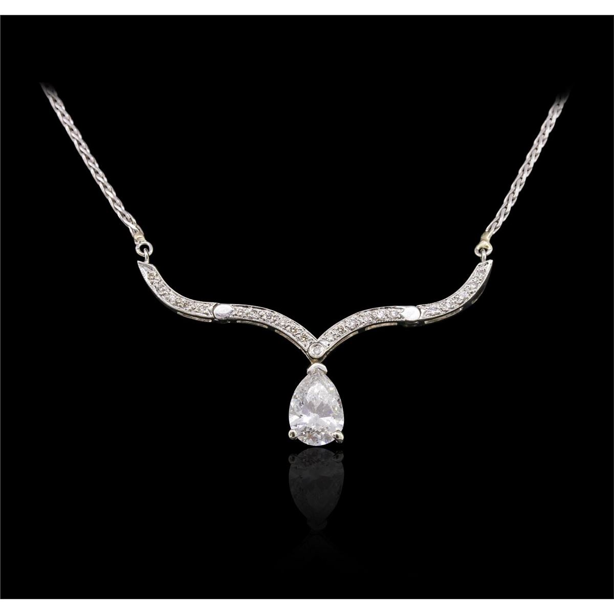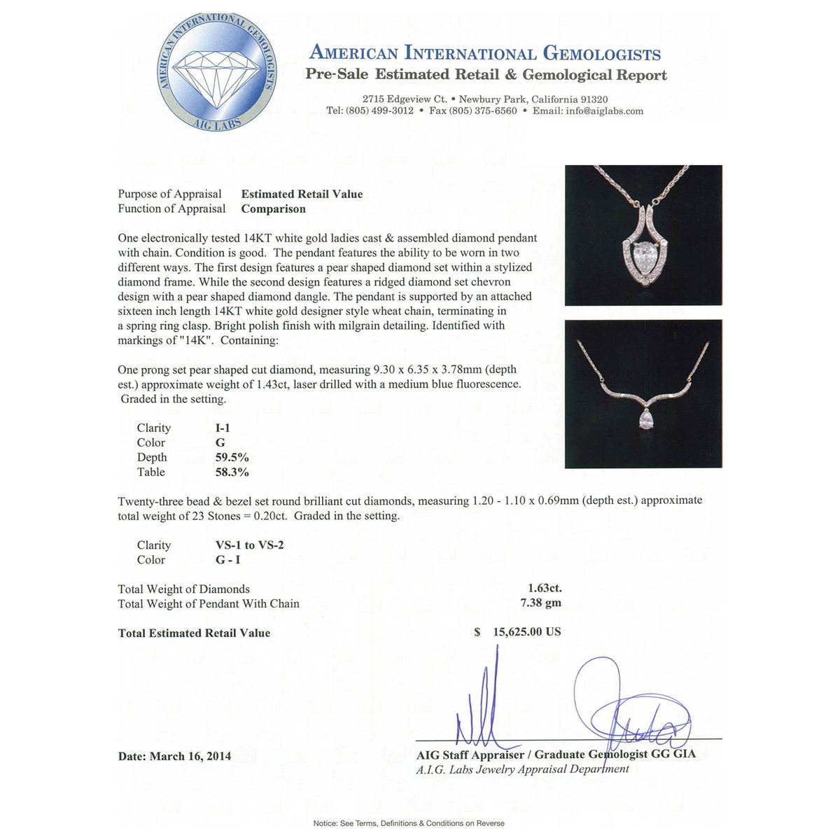 One electronically tested 14KT white gold ladies cast & assembled diamond pendant with chain. Condition is good. The pendant features the ability to be worn in two different ways. The first design features a pear shaped diamond set within a stylized diamond frame. While the second design features a ridged diamond set chevron design with a pear shaped diamond dangle. The pendant is supported by an attached sixteen inch length 14KT white gold designer style wheat chain, terminating in a spring ring clasp. Bright polish finish with milgrain detailing. Identified with markings of "14K". Containing: One prong set pear shaped cut diamond, measuring 9.30 x 6.35 x 3.78mm (depth est.) approximate weight of 1.43ct, laser drilled with a medium blue fluorescence. Graded in the setting. Clarity: I-1. Color: G Depth 59.5%. Table 58.3%. Twenty-Three bead & bezel set round brilliant cut diamonds, measuring 1.20 - 1.10 x 0.69mm (depth est.) approximate. Total Weight of 23 Stones = 0.20ct. Graded in the setting. Clarity: VS-1 to VS-2. Color: G - I. Total Weight of Diamonds 1.63ct. Total Weight of Pendant With Chain 7.38 grams. AIG Appraised at $15,625.00.
