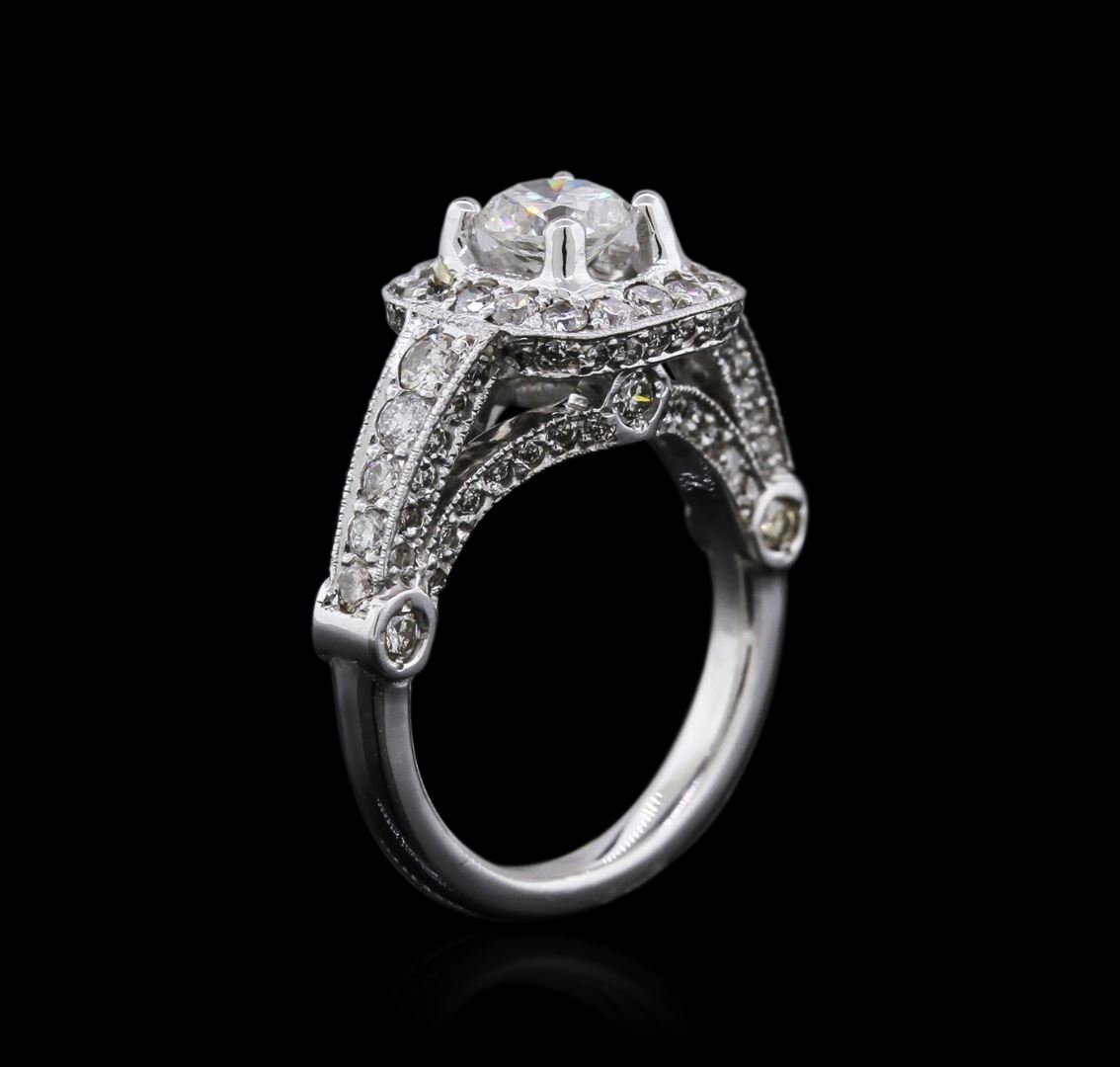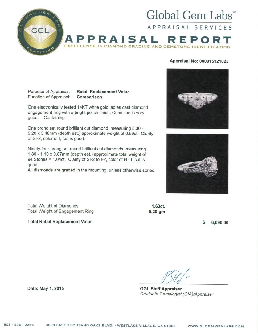 One electronically tested 14KT white gold ladies cast diamond engagement ring with a bright polish finish. Condition is very good. Containing: One prong set round brilliant cut diamond, measuring 5.30 - 5.20 x 3.48mm (depth est.) approximate weight of 0.59ct. Clarity: SI-2. Color: I, Cut is Good. Ninety-Four prong set round brilliant cut diamonds, measuring 1.80 - 1.10 x 0.87mm (depth est.) approximate. Total Weight of 94 Stones = 1.04ct. Clarity: SI-2 to I-2. Color: H - I, Cut is Good. All diamonds are graded in the mounting, unless otherwise stated. Total Weight of Diamonds 1.63ct. Total Weight of Engagement Ring 5.20 grams. GGL Appraised at $6,090.00.