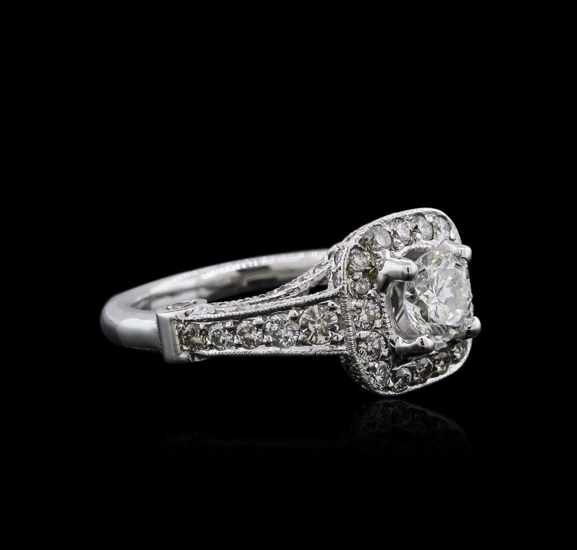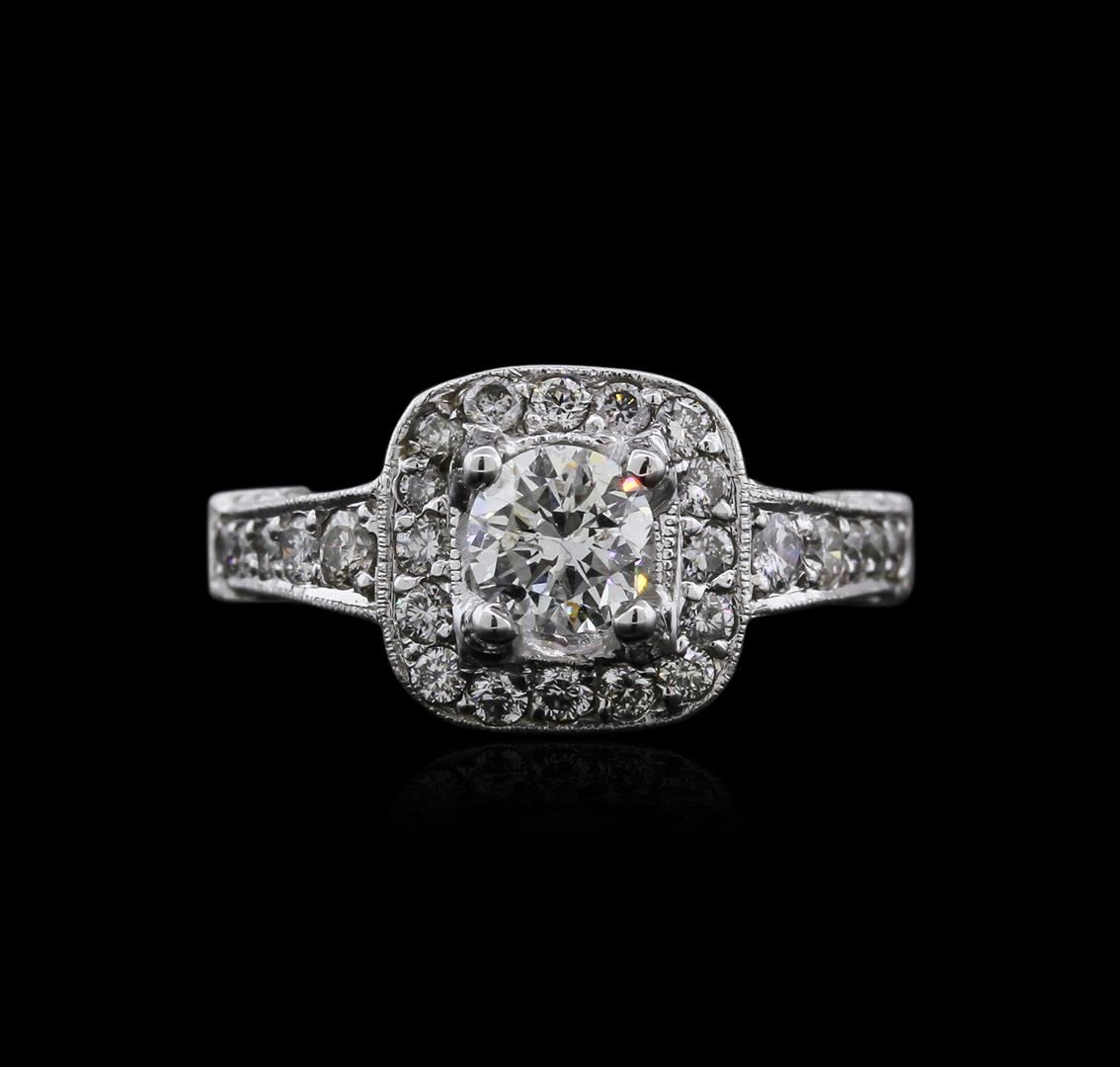 One electronically tested 14KT white gold ladies cast diamond engagement ring with a bright polish finish. Condition is very good. Containing: One prong set round brilliant cut diamond, measuring 5.30 - 5.20 x 3.48mm (depth est.) approximate weight of 0.59ct. Clarity: SI-2. Color: I, Cut is Good. Ninety-Four prong set round brilliant cut diamonds, measuring 1.80 - 1.10 x 0.87mm (depth est.) approximate. Total Weight of 94 Stones = 1.04ct. Clarity: SI-2 to I-2. Color: H - I, Cut is Good. All diamonds are graded in the mounting, unless otherwise stated. Total Weight of Diamonds 1.63ct. Total Weight of Engagement Ring 5.20 grams. GGL Appraised at $6,090.00.