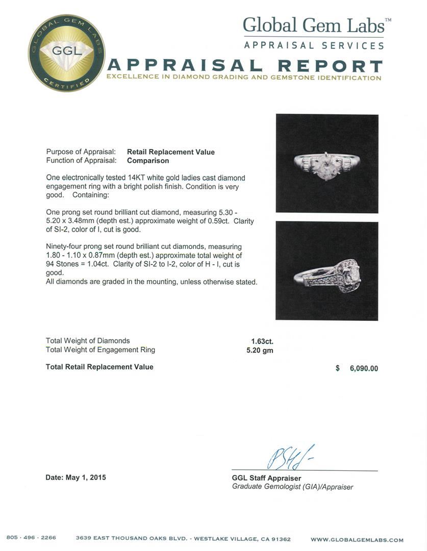 One electronically tested 14KT white gold ladies cast diamond engagement ring with a bright polish finish. Condition is very good. Containing: One prong set round brilliant cut diamond, measuring 5.30 - 5.20 x 3.48mm (depth est.) approximate weight of 0.59ct. Clarity: SI-2. Color: I, Cut is Good. Ninety-Four prong set round brilliant cut diamonds, measuring 1.80 - 1.10 x 0.87mm (depth est.) approximate. Total Weight of 94 Stones = 1.04ct. Clarity: SI-2 to I-2. Color: H - I, Cut is Good. All diamonds are graded in the mounting, unless otherwise stated. Total Weight of Diamonds 1.63ct. Total Weight of Engagement Ring 5.20 grams. GGL Appraised at $6,090.00.