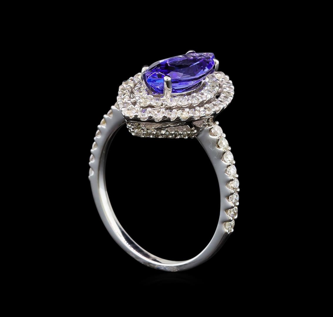 One electronically tested 14KT white gold ladies cast tanzanite and diamond ring with a bright polish finish. Identified with markings of "14K". Condition is new. Containing: One prong set marquise modified brilliant cut natural tanzanite, measuring 11.00 x 6.00 x 3.90mm, approximate weight of 1.64ct., clarity is eye clean, type I, medium light, moderately strong, violet color, (GIA V 4/4), cut is good. Sixty-Four prong set round brilliant cut diamonds, measuring 1.30 - 1.20 x 0.75mm (depth est.) approximate total weight of 64 Stones = 0.45ct. Clarity: SI-1 to I-1. Color: I - J, Cut is Good. Colored gemstones are presumed to have been subjected to commonly used enhancement processes. All diamonds and colored gemstones are graded in the mounting, unless otherwise stated. Total Weight of Colored Stones 1.64ct. Total Weight of Diamonds 0.45ct. Total Weight of Ring 4.00 grams. GGL Appraised at $3,450.00.