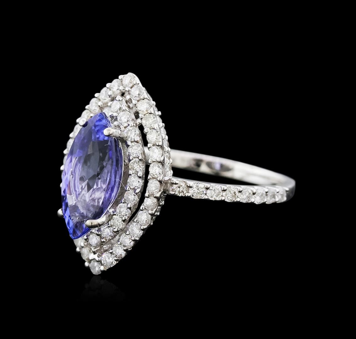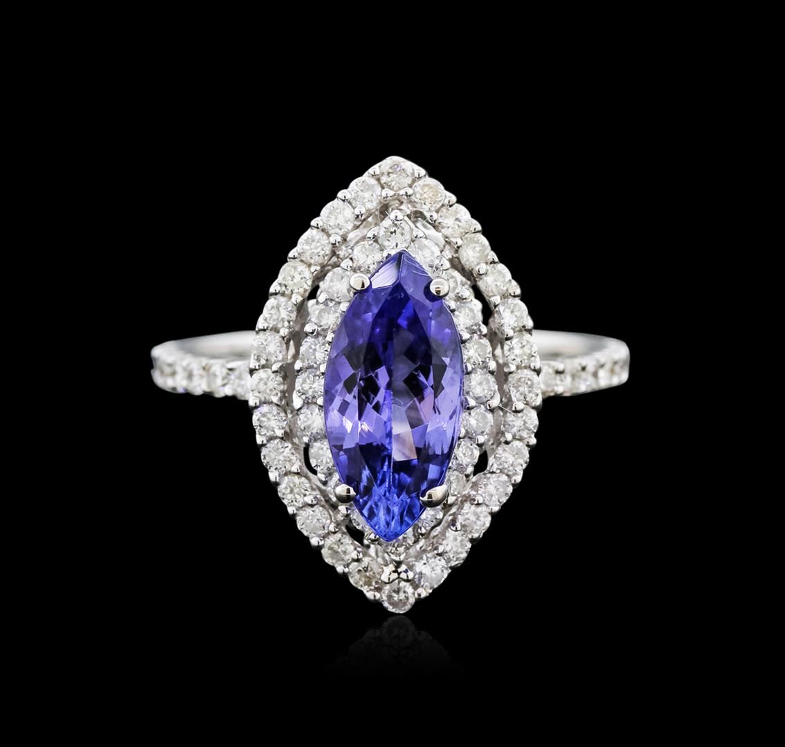 One electronically tested 14KT white gold ladies cast tanzanite and diamond ring with a bright polish finish. Identified with markings of "14K". Condition is new. Containing: One prong set marquise modified brilliant cut natural tanzanite, measuring 11.00 x 6.00 x 3.90mm, approximate weight of 1.64ct., clarity is eye clean, type I, medium light, moderately strong, violet color, (GIA V 4/4), cut is good. Sixty-Four prong set round brilliant cut diamonds, measuring 1.30 - 1.20 x 0.75mm (depth est.) approximate total weight of 64 Stones = 0.45ct. Clarity: SI-1 to I-1. Color: I - J, Cut is Good. Colored gemstones are presumed to have been subjected to commonly used enhancement processes. All diamonds and colored gemstones are graded in the mounting, unless otherwise stated. Total Weight of Colored Stones 1.64ct. Total Weight of Diamonds 0.45ct. Total Weight of Ring 4.00 grams. GGL Appraised at $3,450.00.
