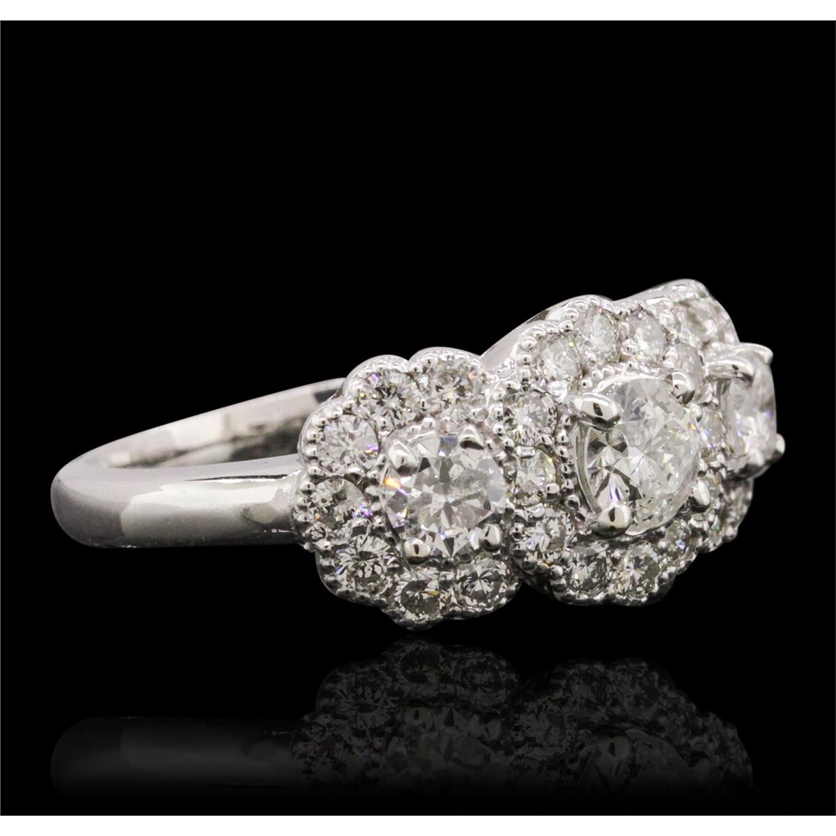 One electronically tested 14KT white gold ladies cast diamond ring. Condition is new, good workmanship. The ring features a trio of diamonds set within diamond set floral bezel, completed by a two and one-half millimeter wide band. Bright polish finish with milgrain detailing. Identified with markings of "K14". Containing: One prong set round brilliant cut diamond, measuring 4.80 - 4.75 x 2.80mm (depth est.) approximate weight of 0.48ct. Graded in the setting. Clarity: I-1. Color: J Two prong set round brilliant cut diamonds, measuring 3.70 - 3.65 x 2.21mm (depth est.) approximate. Total Weight of 2 Stones = 0.46ct. Color & clarity grade are an average for the pair. Graded in the setting. Clarity: I-1. Color: H Twenty-Six bezel set round brilliant cut diamonds, measuring 1.90 - 1.80 x 1.11mm (depth est.) approximate. Total Weight of 26 Stones = 0.70ct. Graded in the setting. Clarity: SI-1 to I-1. Color: G - I. Total Weight of Diamonds 1.64ct. Total Weight of Ring 4.93gm. AIG Appraised at $6,415.00.