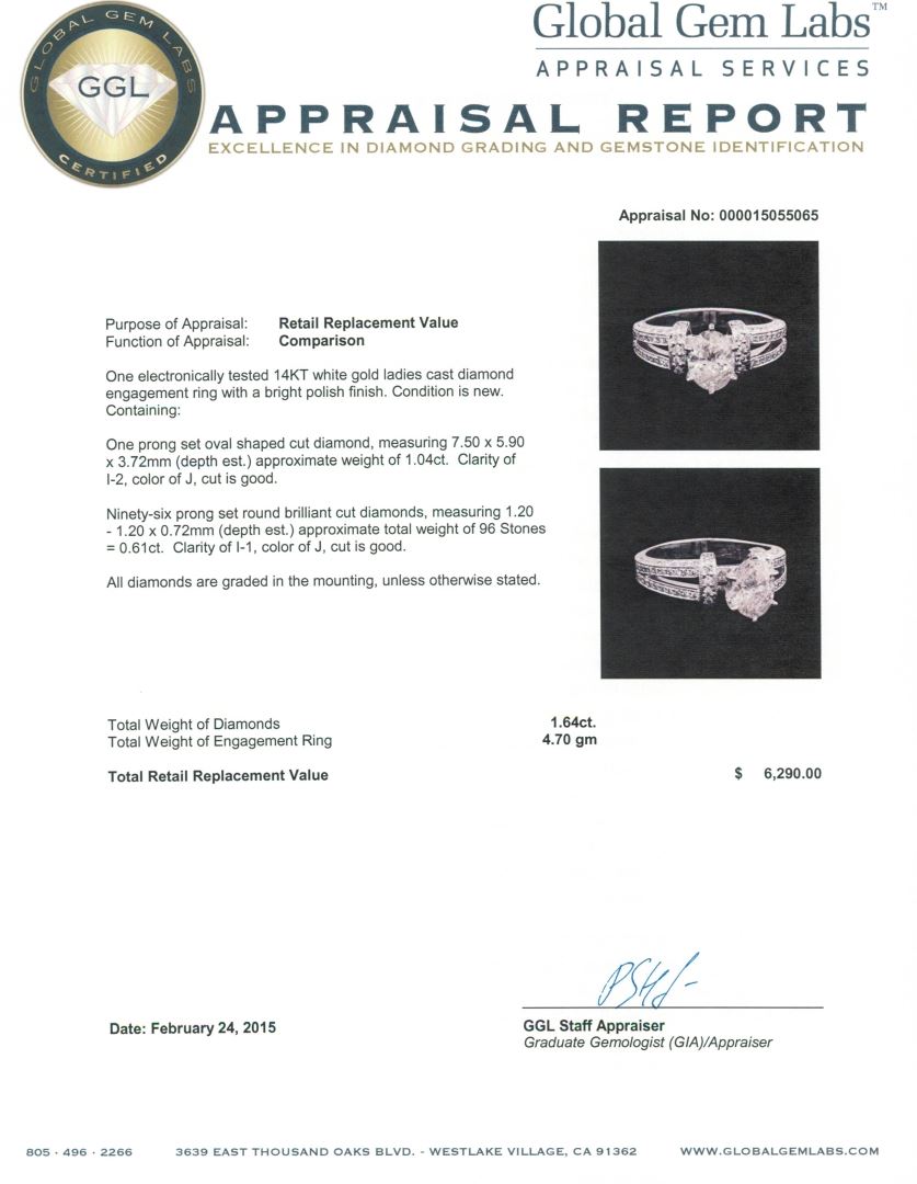 One electronically tested 14KT white gold ladies cast diamond engagement ring with a bright polish finish. Condition is new. Containing: One prong set oval shaped cut diamond, measuring 7.50 x 5.90 x 3.72mm (depth est.) approximate weight of 1.04ct. Clarity: I-2. Color: J, Cut is Good. Ninety-Six prong set round brilliant cut diamonds, measuring 1.20 - 1.20 x 0.72mm (depth est.) approximate total weight of 96 Stones = 0.61ct. Clarity: I-1. Color: J, Cut is Good. All diamonds are graded in the mounting, unless otherwise stated. Total Weight of Diamonds 1.64ct. Total Weight of Engagement Ring 4.70 grams. GGL Appraised at $6,290.00.
